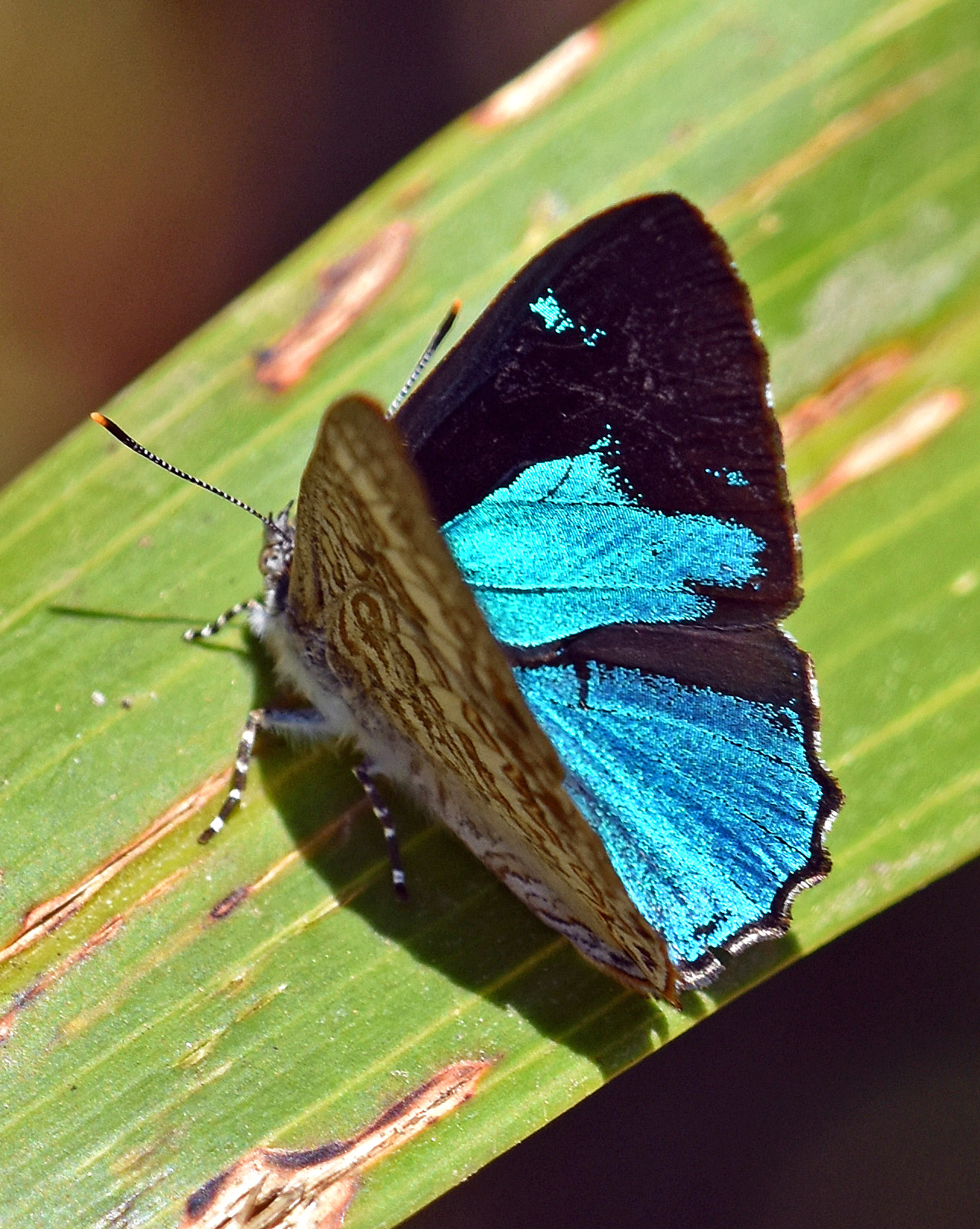 Uppersides on the other hand can be a lot more showy (below), flashes of bright colour and iridescence, which can be shown off when the coast is clear. Often it is the males who sport the most showy adornments, hoping to impress a female enough that she will choose to mate with him. Scientists call this ‘partitioning the function’, which is a fancy way of saying that butterflies divide the purpose of their wings between the two surfaces, enabling them to switch from one behaviour to another, in an instance. The little South East Asian butterfly known as the Common Gem (below) is a good example of this dichotomy of function.