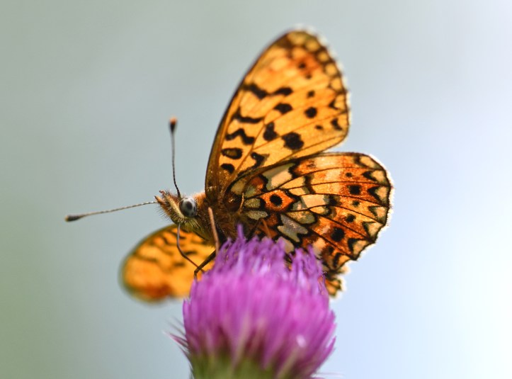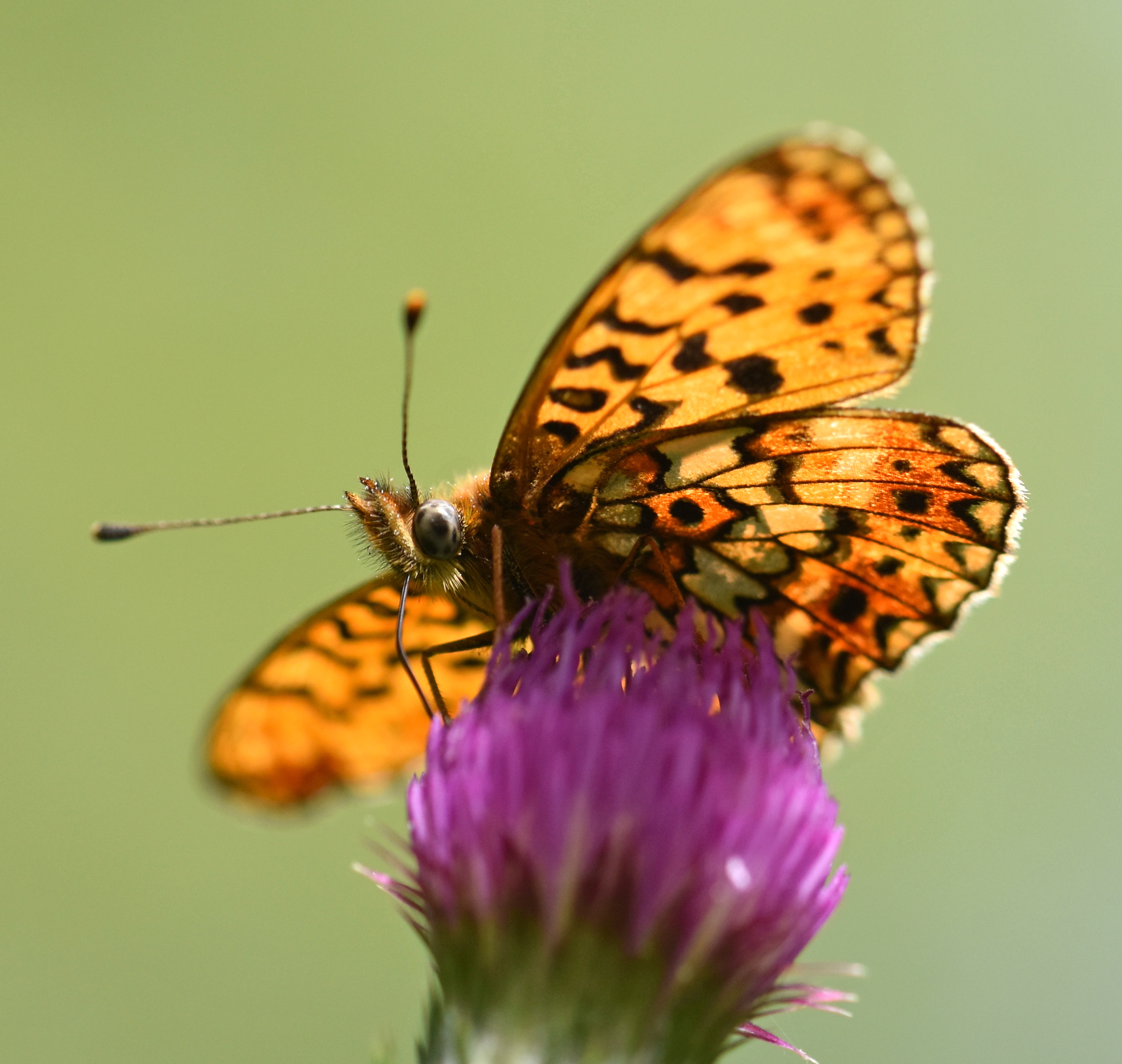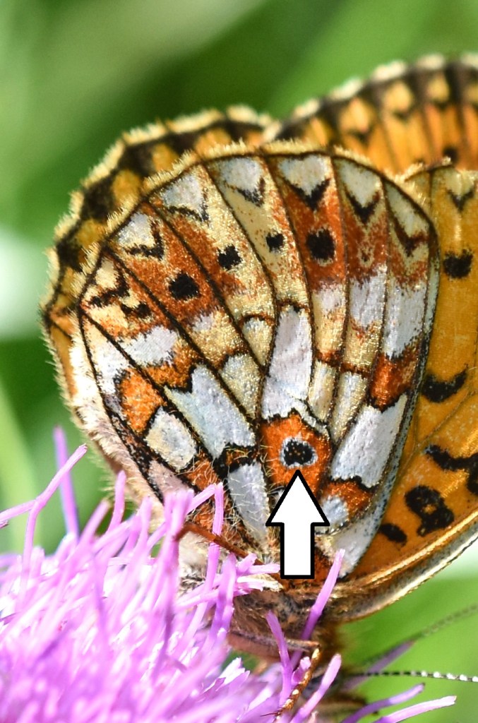 It was whilst looking at images I had taken of Small pearl-bordered fritillary butterflies (Boloria selene) in Spain, that I noticed how prominent the round black spot was on the underside of the hindwings; particularly when viewed from below (below). It almost looks like an eye!
