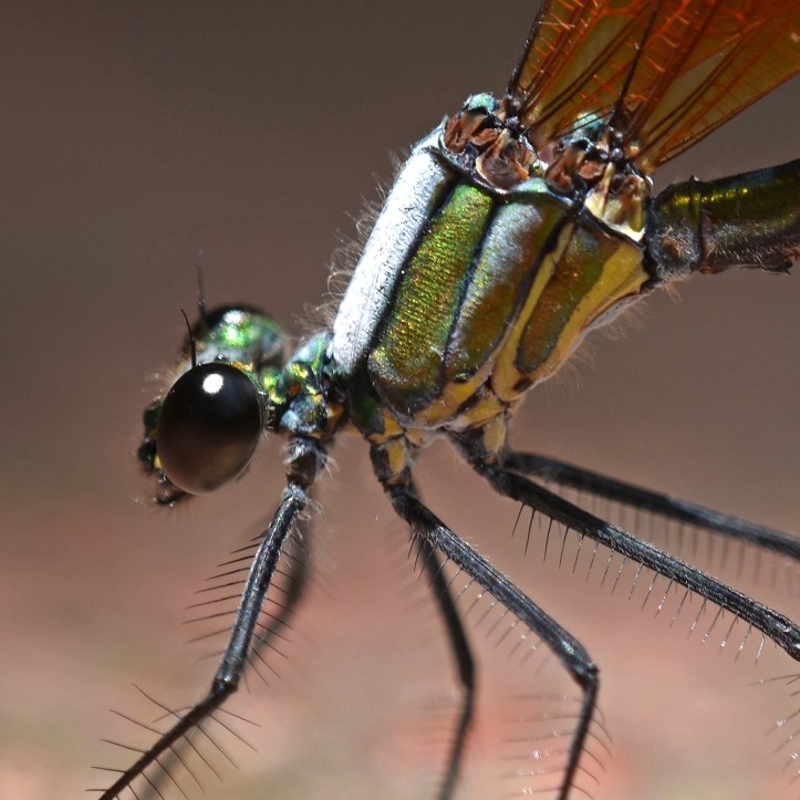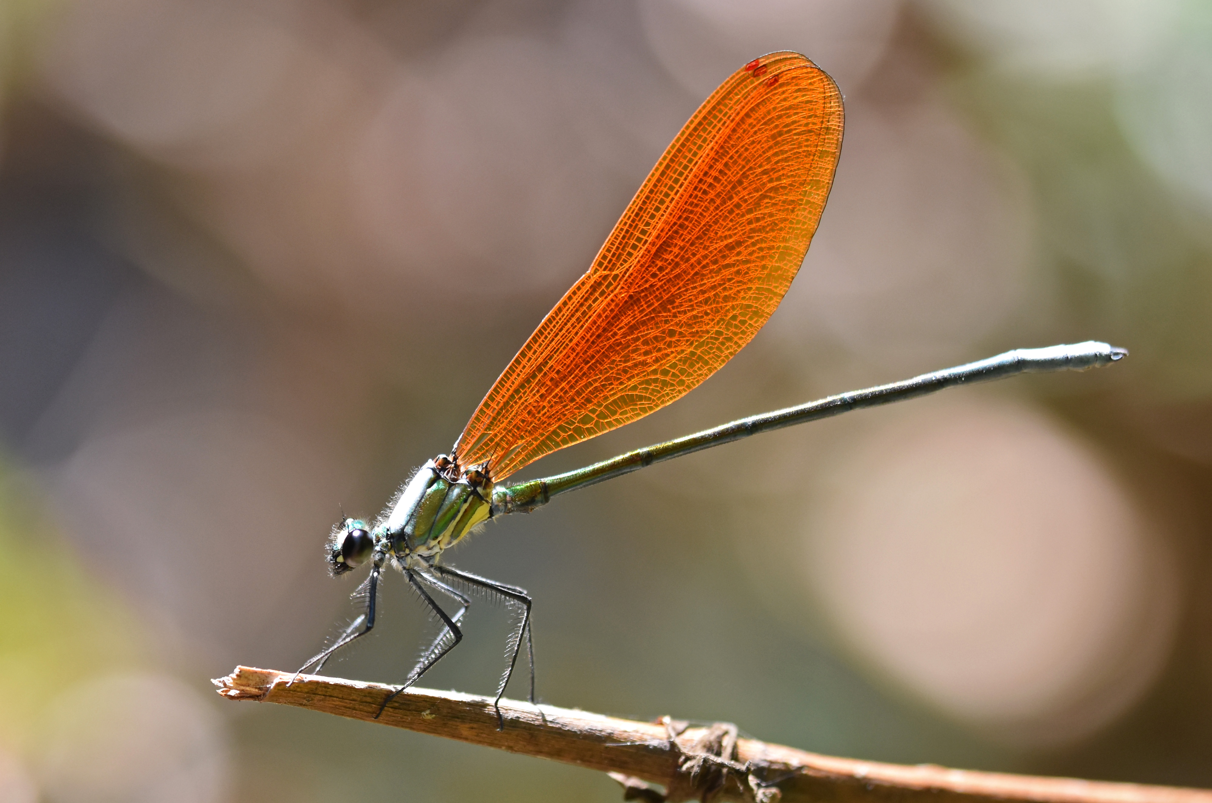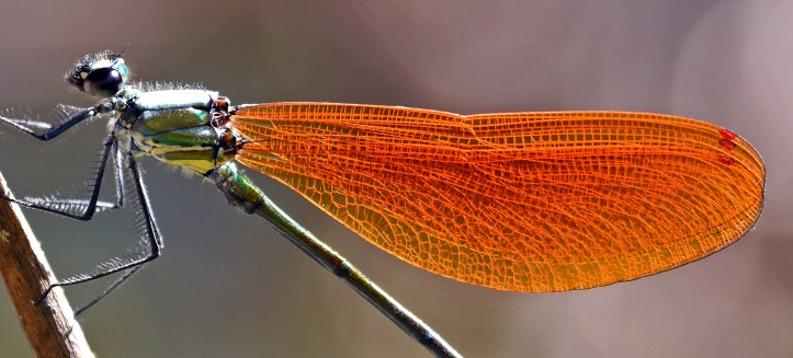 I did not know all this when I first started photographing these damselflies in Thailand, where one species, Anderson’s Greenwing (Mnais andersoni), is quite common in Chiang Mai province in the north of the country. The males are very eye-catching with their bright orange wings and yellow/green thoracic markings; mature males also have a chalky blue pruinosity – or dusty-like coating – covering the upper thorax and the eighth and ninth segments of the abdomen (below).