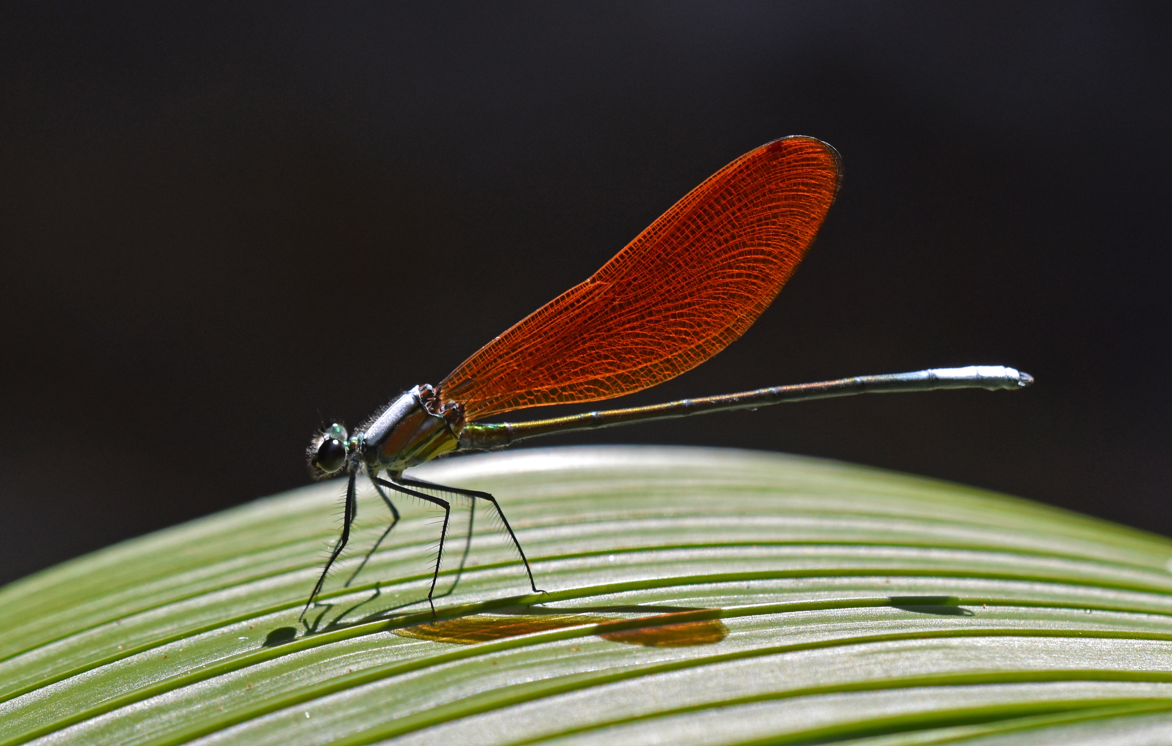 Damselflies in the genus Mnais are unusual in having two types of males: i) orange-winged morphs and ii) clear or glassy- winged (hyaline) forms which look like the females. The orange-winged morphs are highly territorial and fight with each other over desirable territories which are attractive to the females for egg laying. The clear-winged morphs are not territorial and usual lurk in concealed spots around the margins of an orange-winged male’s territory, trying to copulate with any female that they can catch! The two morphs are essentially adopting different strategies for securing mates, and have been called ‘fighters’ and ‘sneaks’.