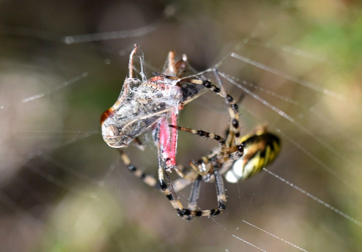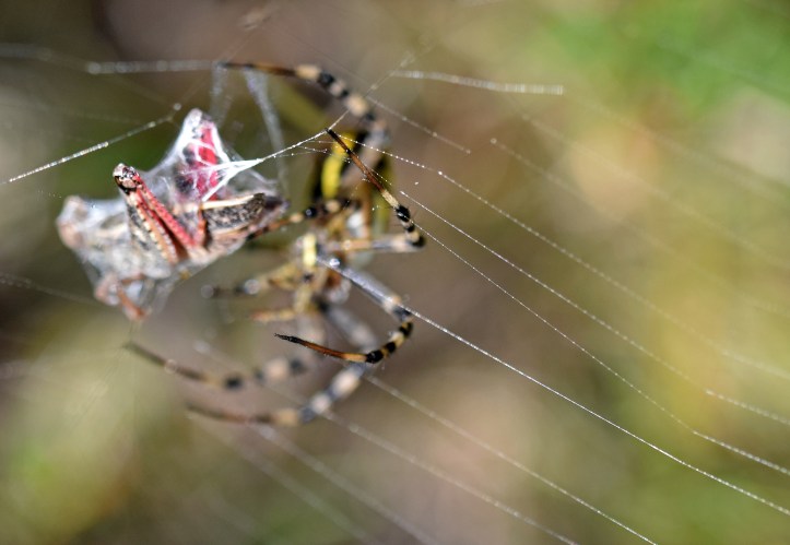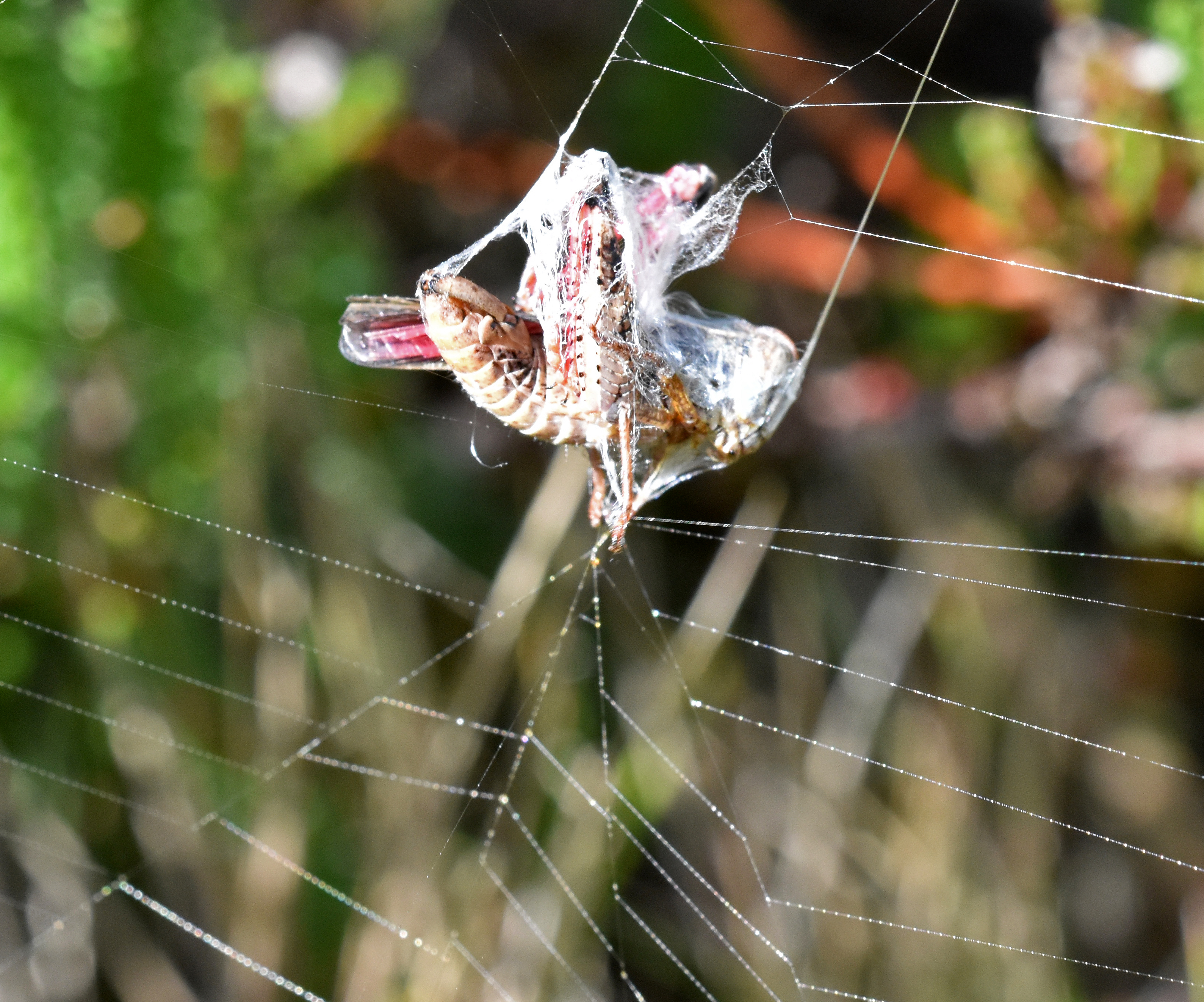No sooner had the spider trussed up its victim, than it rushed back to what it was doing before it was so rudely interrupted: eating another captive! What struck me was how confident it was that the latest victim could not escape! Just a few moments of bondage – spinning it round and round as it extruded the silk – and the job was done. No way that the little grasshopper was going to escape! It had been bound and trussed, a meal for later, in almost an instance! These spiders have been doing this for a very long time! See previous blog: Spiders, silk and packed lunches.