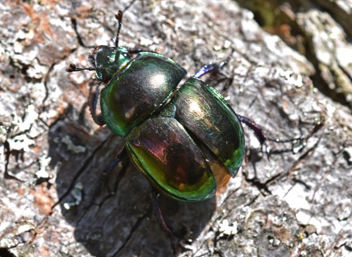 Dung beetle (Trypocopris [=Geotrupes] pyrenaeus var. coruscans) shining in the sun. Galicia, SpainThese beautiful dung beetles are relatively common in NW Spain, and can often be seen flying purposefully through the pine forests, like tiny green helicopters, on a mission to find a cow pat or some horse droppings. They are a variety of Dor beetle, (Trypocopris pyrenaeus var. coruscans), similar to a couple of Dumble Dor beetles we have in the UK, but with a much more metallic, coppery-green sheen, which changes colour as the sun catches the iridescent cuticle. No apologies for blogging about this beetle of again, as it is one of my favourite insects, and continues to fascinate me!