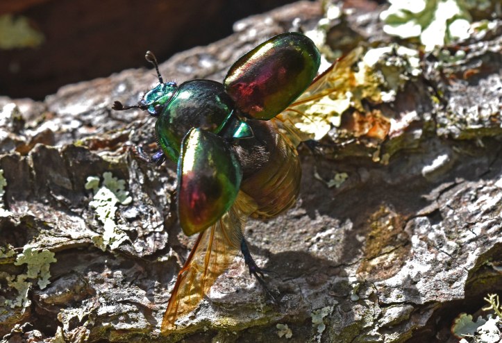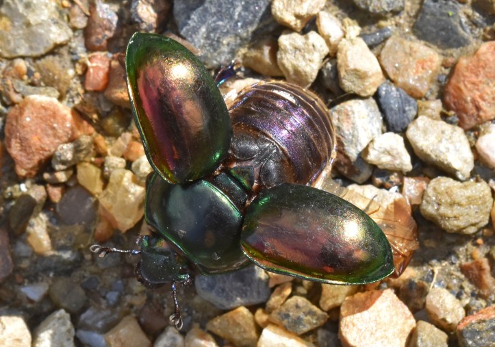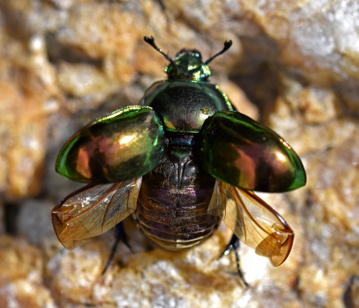 Dung beetle (Trypocopris [=Geotrupes] pyrenaeus var. var. coruscans) wing cases open, wings spread and ready to go!In conclusion, deploying wings in beetles and other insects is a remarkable engineering feat and has been the focus of many detailed studies. Understanding how insects such as this fold and unfold their wings, from a single point at the base of the wing, could provide many useful solutions to engineering problems. In the words of one researcher:
