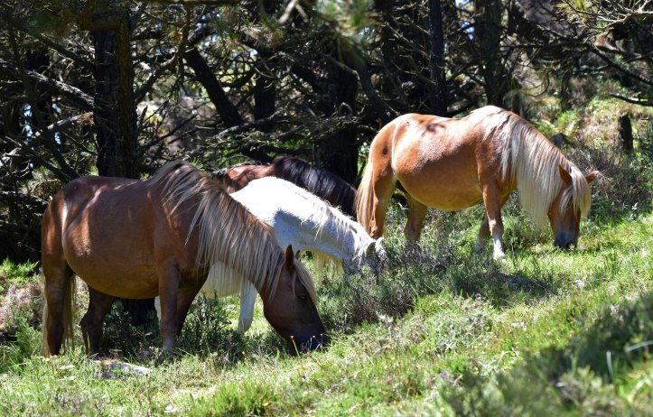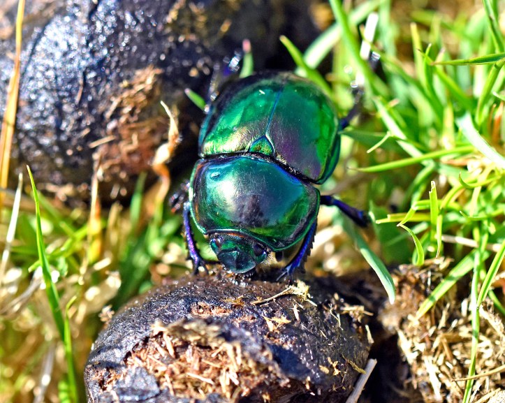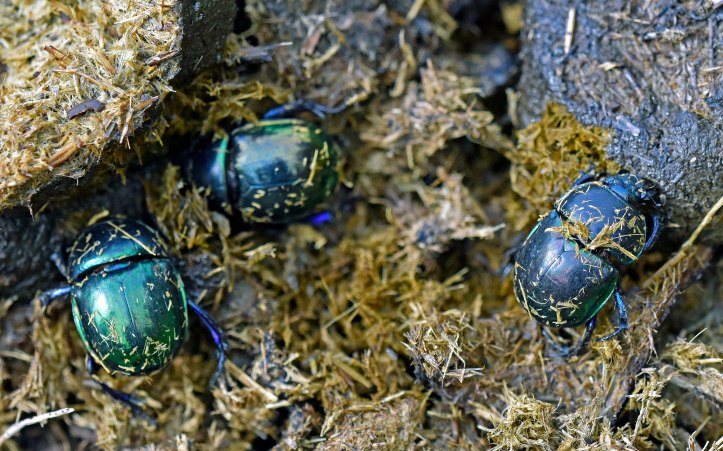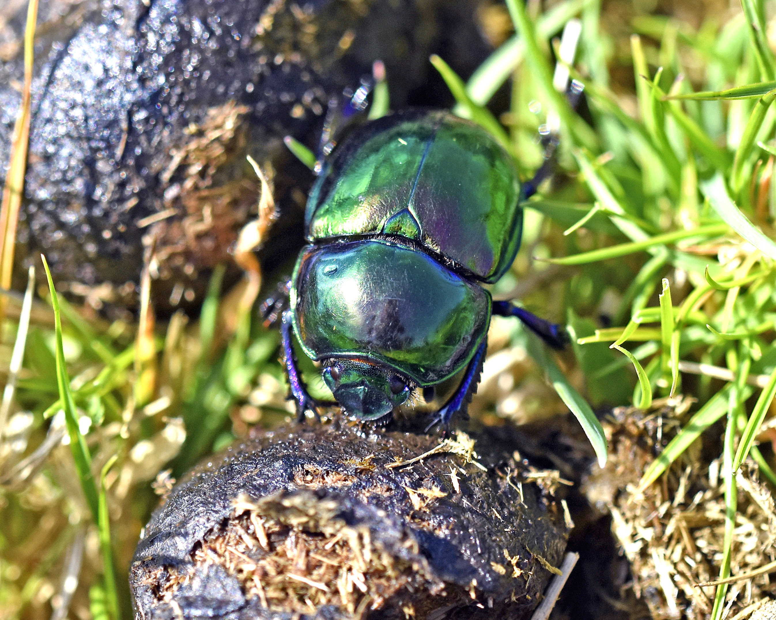 Dung beetle (Trypocopris [=Geotrupes] pyrenaeus var. coruscans) rolling in horse dung. Galicia, SpainIn Galicia, in NW Spain, there are many horses and cows on the hillsides, and the Galician ponies wander among the pine forests and heather moorlands, where this dung beetle seems to be, thank goodness, present in good numbers. It would, as I have mentioned before, make an excellent insect to study in terms of its ecology (especially in relation to traditional grazing methods), commensals (phoretic mites), iridescent colouration, impact of ivermectins (pesticide treatments for cow parasites), effects of climate change, and so on. Particularly, because it is so abundant and easy to find in the summer. Just find the dung!