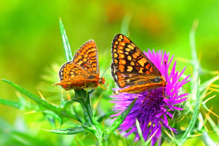 Courting Marsh Fritillaries (Eurodryas aurina); the larger female is on the right. Spain