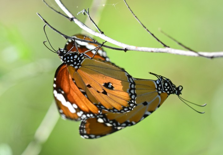 Plain tigers (Danaus chrysippus bataviana) male and female in copula; male doing the carrying. Bali, Indonesia