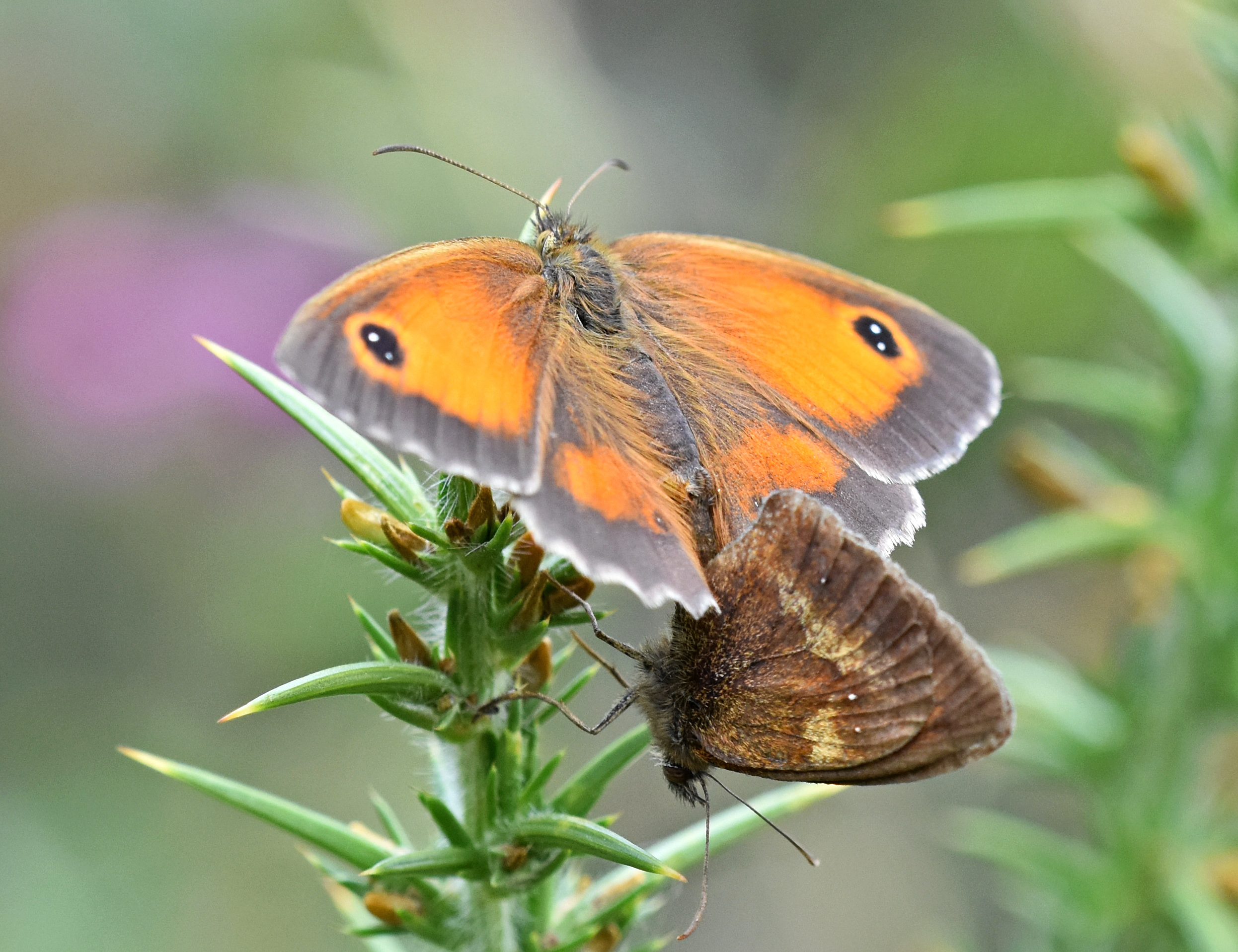 Gatekeeper Butterflies (Pyronia tithonus) mating pair; female on top.