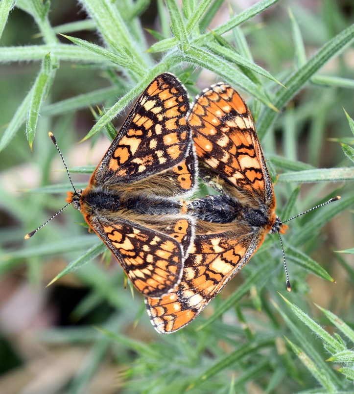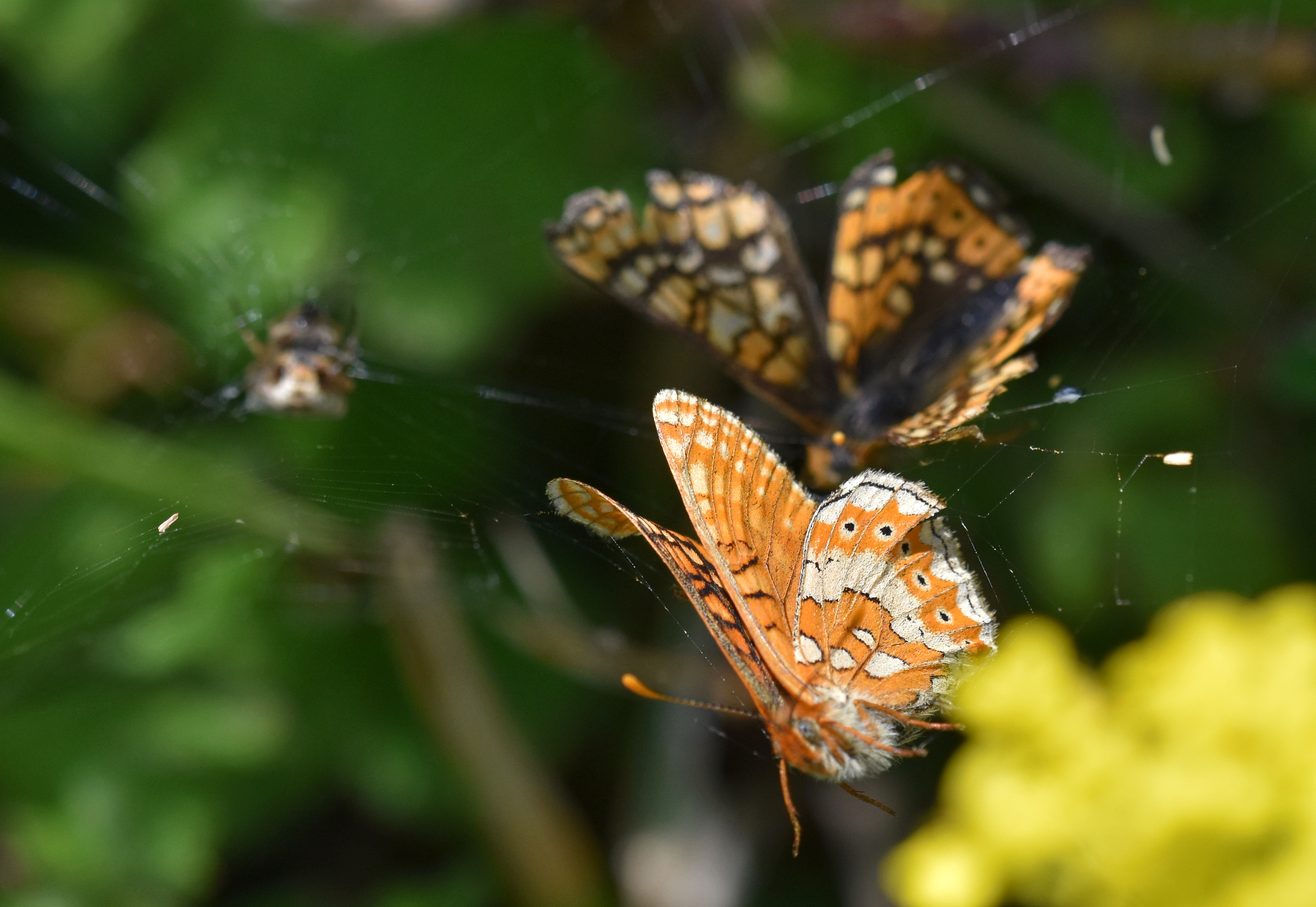 Being chased to harassed by males carries a certain risk in itself. I followed this pair of courting Marsh Fritillaries (Eurodryas aurina) for quite some time; eventually, the female flew off – chased by the male – but they both became ensnared in a spider’s web (below). In this case, I freed them from the spider’s web, but it made me think about how often such accidents happen in nature?