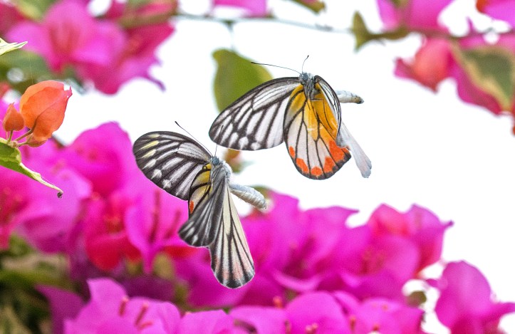 Painted Jezebel (Delias hyparete indica) male chasing female in flight. Does she like to be chased, or is she trying to escape? Thailand
