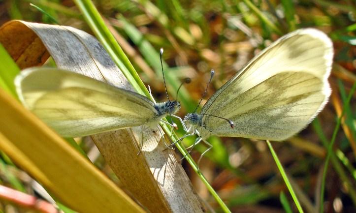 The male has to court the female and gain her acceptance via attraction and persuasion! Using his looks – flashy wing colours for example – or courtship dances and seductive scents (pheromones). The female may reject many suitors before she finds a male who is good for her! Rejection and persistence is part and parcel of a male butterfly’s life! Sometimes they get so carried away (with hormones!) that they attempt to mate with a different species, as shown below, with the small white butterfly bending his abdomen towards a much larger female of another species! He had just chased her through the forest!