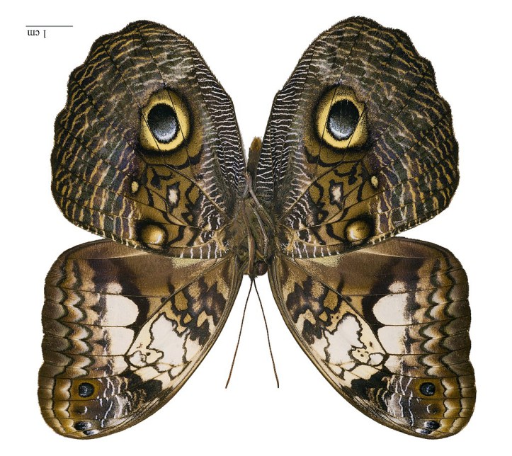 […] Let’s look at another example: the owl butterfly, or yellow-edged giant owl (Caligo atreus) to give it its full name (below). The underside, with its complex patterning is fairly cryptic, no doubt helping to camouflage this large butterfly, but look at the massive eyespot! Something else is going on: it is trying to look like an owl, or just very startling, surely aimed at frightening or freaking out anything thinking about trying to eat it! See it viewed upside down, here. […]
