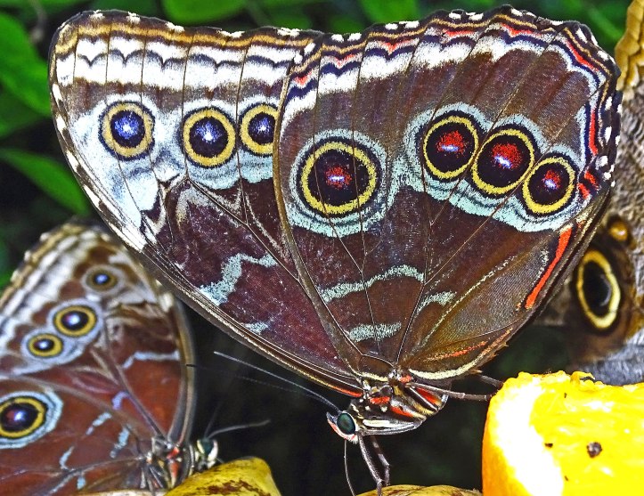 First of all, there are many different types of spots (and other shapes) on butterfly wings, with lots of different functions, including: avoiding being eaten by deflecting attacks; marks for sexual selection; warning patterns and colours; or as markings to improve camouflage. Genuine eyespots are highly conspicuous, circular (or semi-round) shapes, consisting of a series of concentric circles. The large, colourful eyespots on the ventral (under) side of a Blue Morpho’s wing (below), are classic examples. In this case, have they evolved to startle predators, or to deflect the beaks of pecking birds away from the body of the butterfly? I’m not sure. It’s possible that the large size of these eyespots make them highly intimidating, and eyespots to deflect pecks or blows from a predator, would probably be better located further towards the wing margins ( Kodandaramaiah et al., 2013)