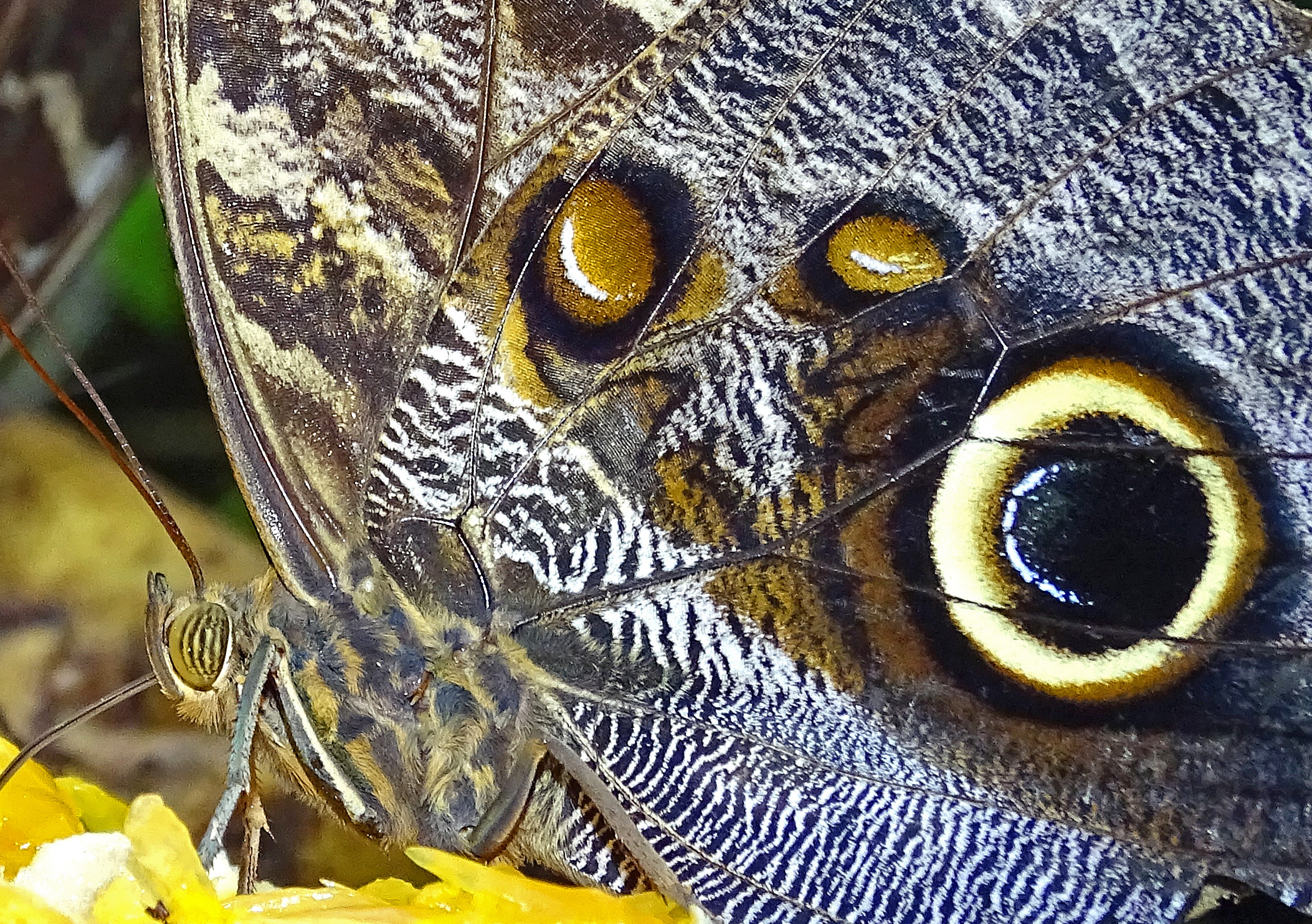 Incidentally, the eyespots on an Owl butterfly, make a very convincing owl, when viewed upside-down! (below).