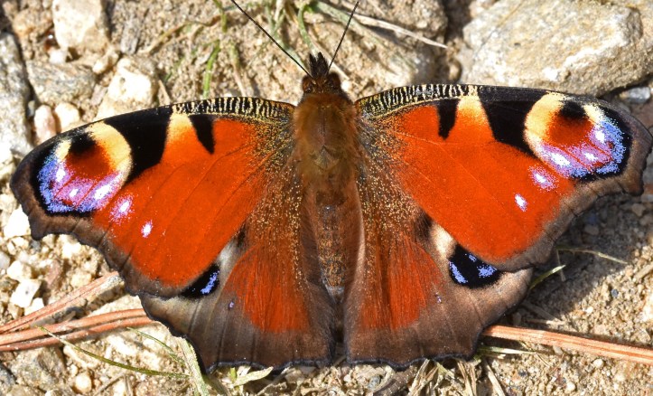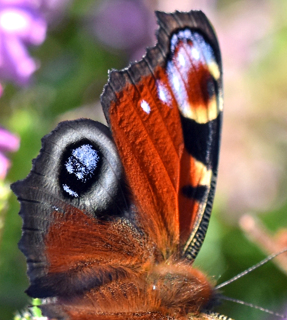 So although the large eyespots of the dorsal forewings don’t look like very convincing eyes, we must remember they did not evolve to fool or startle us, but their own predators. We don’t really know how they appear to birds and lizards, but they may look for certain cues in the eyespot, that sends them the message that it is an eye. The eyespots on the dorsal surface of the hindwings (below) of the Peacock are rather different: there is a large white concentric circle around a black oval, within which are many tiny bluish-white scales.