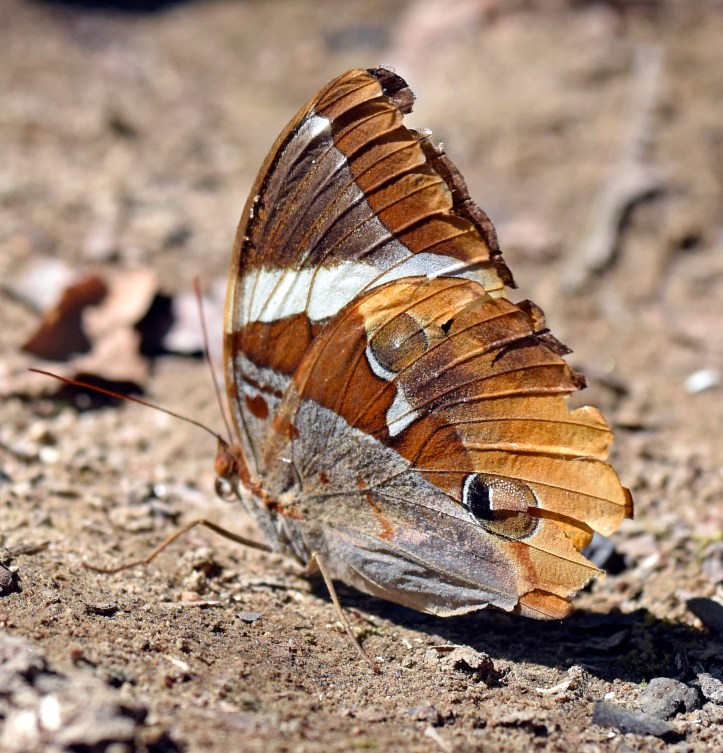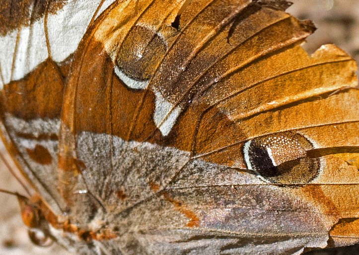 Another butterfly with a very convincing, ‘eye-like’ eyespot – this one on the ventral hindwing – is the Tufted Jungleking butterfly (top and below), a nymphalid (Morphinae) from Thailand. It’s almost as though it were painted by an artist! There is a black patch, a white stripe, a white crescent and lots of tiny white dots. These all create the illusion of a very real eye (at least to my way of seeing). It is very hard not to think that the butterfly has evolved an ‘eye-like’ eyespot via natural selection. But although these eyespots look to us like very convincing fake eyes, there is not very much definitive scientific evidence (Stevens, 2005), at least until fairly recently, to back this eye-mimicking theory. It may be that we are just very good at ‘making sense’ of patterns such as this?