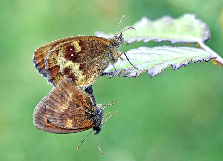 Whilst larger males might benefit in competition with other males, smaller males benefit from being able to develop into adults much faster. Emerging from their pupae before females – called protandry – puts them at an advantage in terms of mating, being able to take advantage of the high receptivity of females, just after eclosion. Below are a pair of mating Gatekeepers; the female is larger so gets to do the heavy lifting!