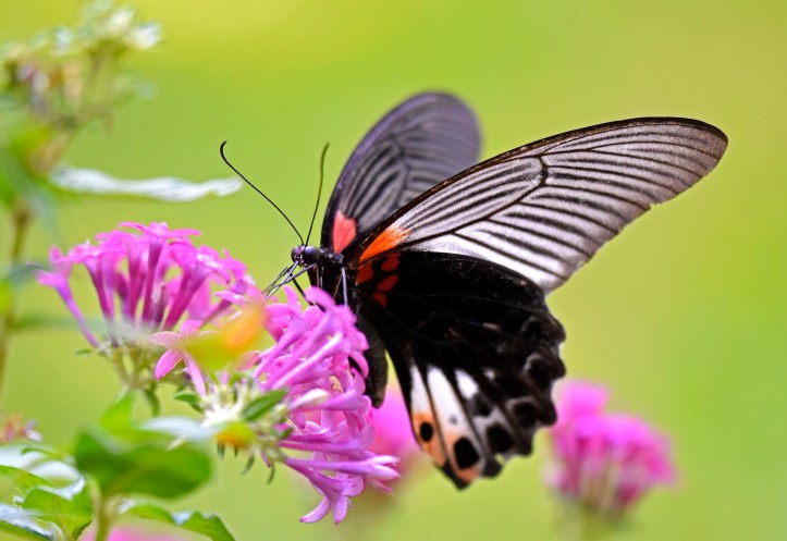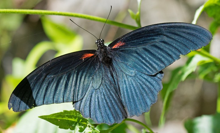 Another reason why the sexes might differ, is because in some species the females are mimicking another butterfly. Why only the females of a species engage in mimicry is a moot point, but again comes down to the different pressures operating on the two sexes. Females might benefit from looking like another (poisonous) species, to avoid being eaten, but males need to compete with other males – and look flashy enough to attract females of their own sex; so looking like another butterfly just does not cut the mustard! Below is a male Great Mormon (Papilio memnon agenor) and the photograph below that is the very different looking female, which is trying to mimic a totally different, poisonous species. There are similarities though; they both have the rather nice, red ‘shoulder’ flashes! On the bases of their fore-wings.