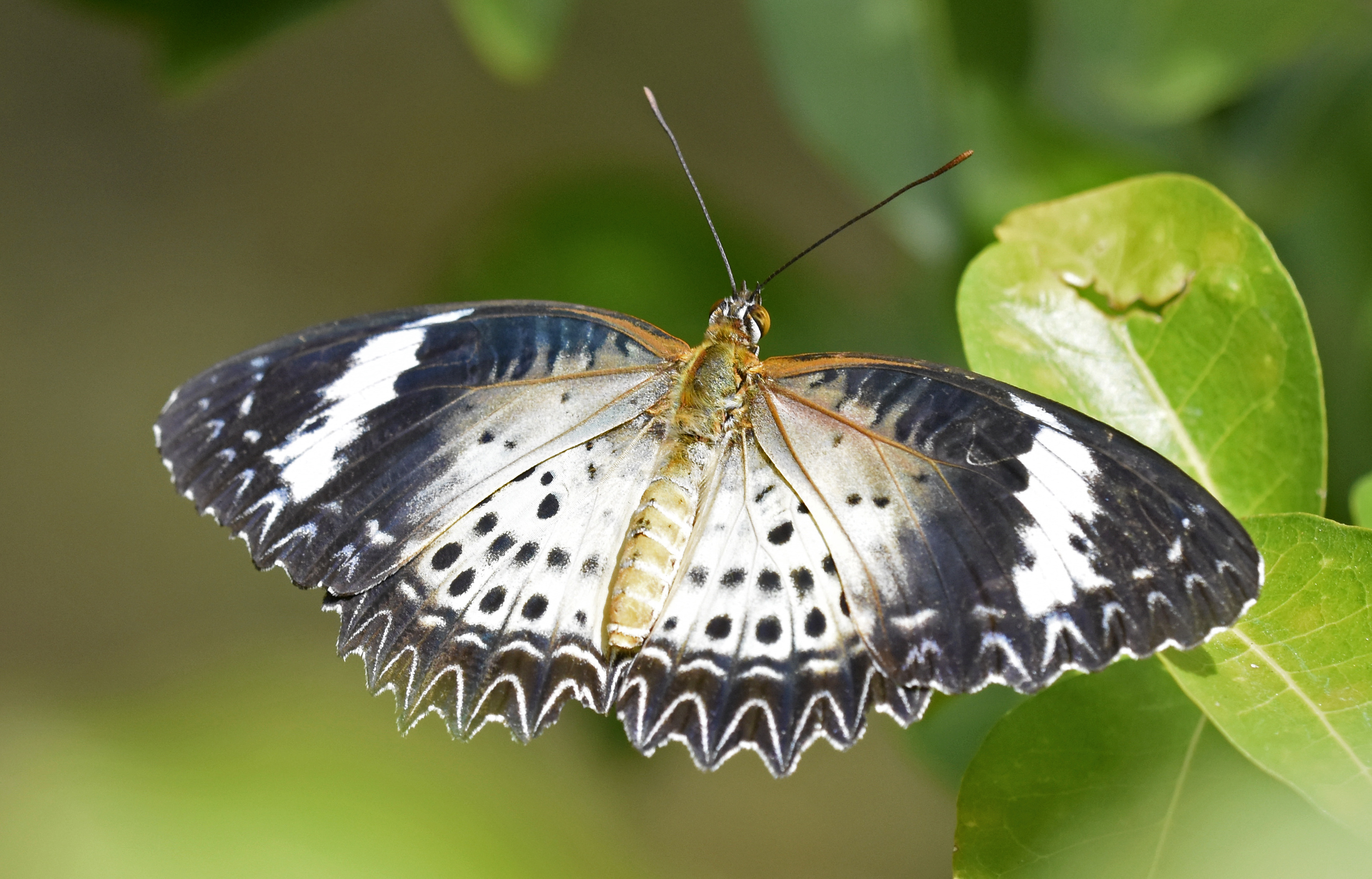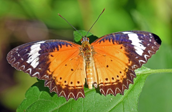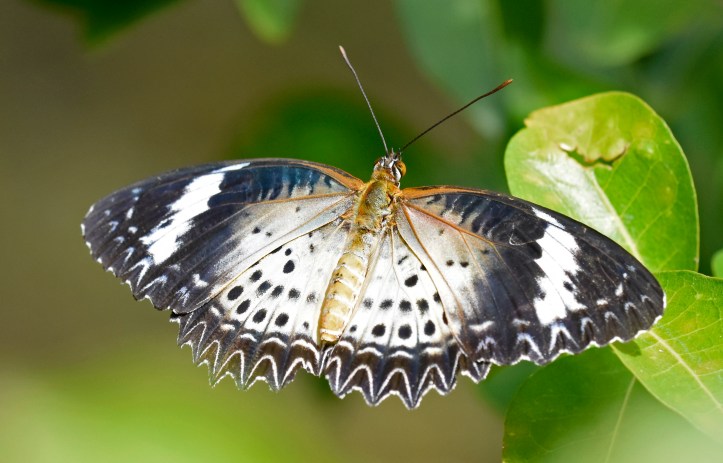 In the tropical Leopard lacewing (below), the female is a more subtle, less colourful version of the male (below).