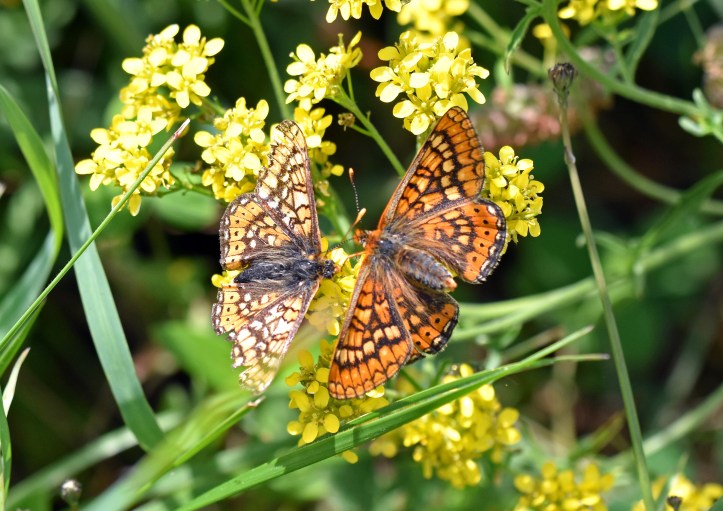 The technical answer as to why some male and female butterflies differ (sexual dimorphism) relates to the fact that there are different selection pressures operating on each sex. In other words, they have different roles and aspirations, and both natural and sexual selection has worked to evolve the observed differences between them. But why this only applies in the case of some species, and not others, is less easy to explain, I think. Here are a pair of courting Marsh fritillaries, where the female is slightly larger, and a bit differently coloured, than the male.