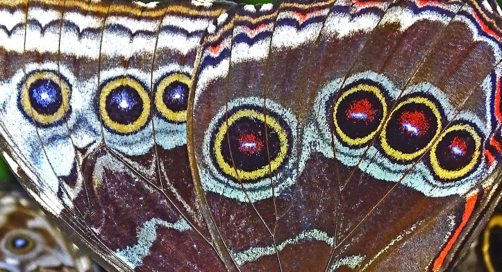 Finally, I will finish with some wonderful eyespots (below) on the undersides of a Blue morpho (Morpho peleides). I have tweaked the image a little to bring out the colours. We can think of the genes switching on and off during the development of the butterfly – whilst it was still a caterpillar – to produce these fantastic patterns!