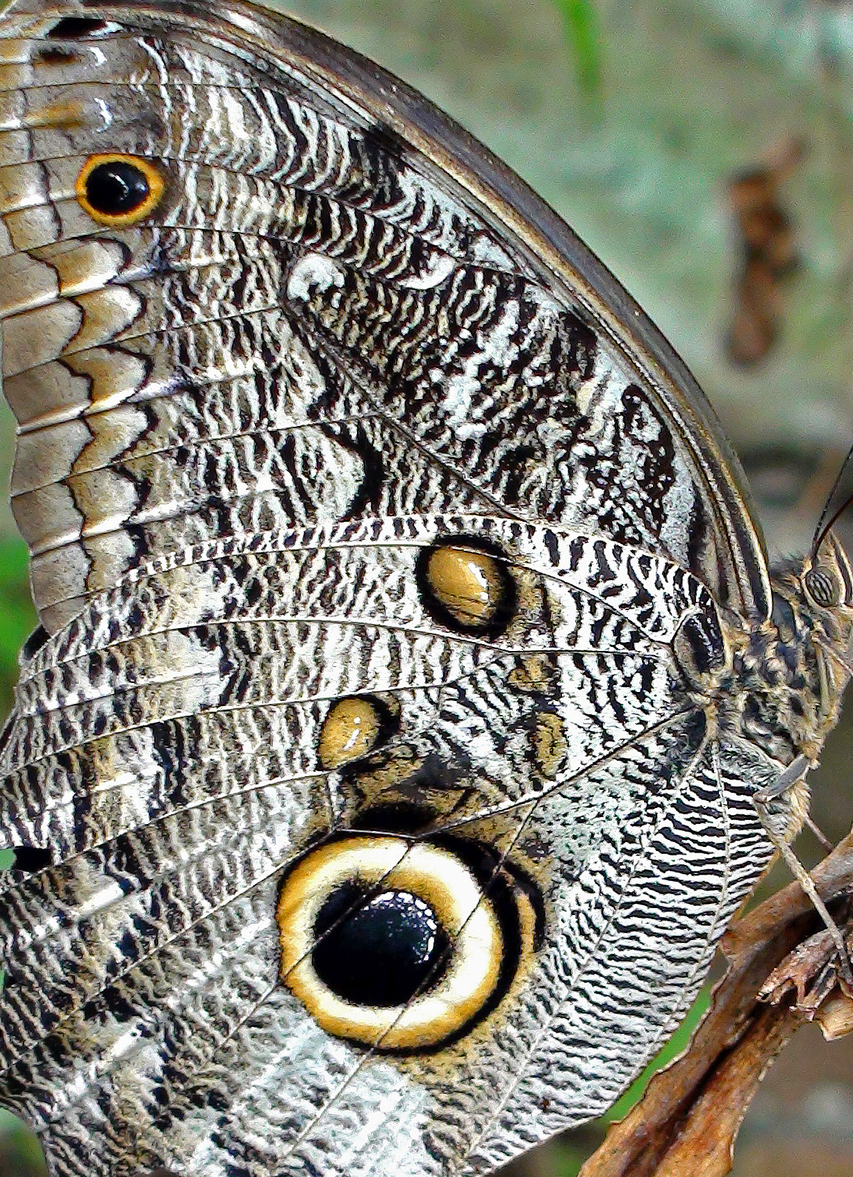 Detail of Blue morpho (Morpho peleides) ventral wings, showing prominent eyespots (Amsterdam zoo). Compare with the bright blue upper surface (see above).