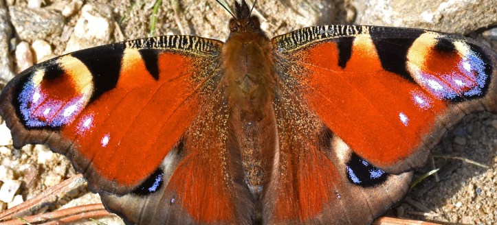 Peacock (Aglais io) basking with wings open. Striking dorsal wing colouration, with conspicuous eyespots.