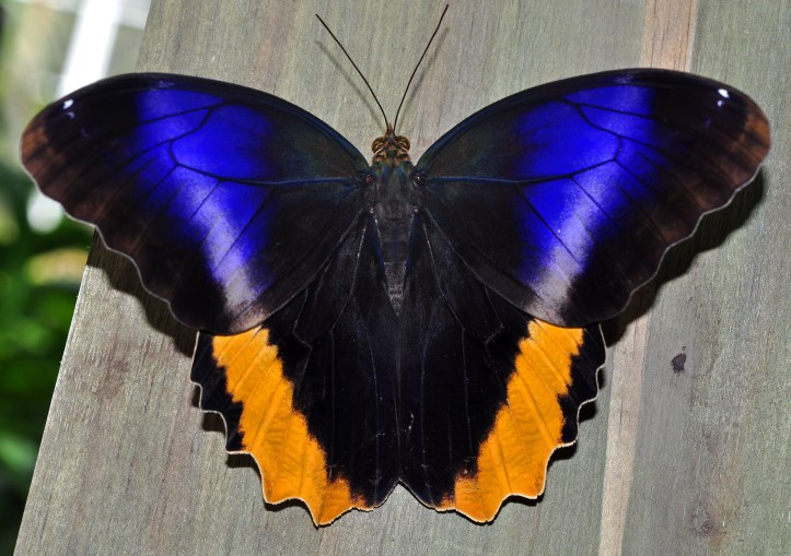 The upperside of the owl butterfly is a complete contrast: with extravagantly shiny blue (structural) and orange (pigmentary) colours (below). It only has to open its wings to transform itself from one state to the other. What a statement! These gorgeous upper surface colours have been called “seductive messages” by researcher Anupama Prakash, because they are aimed at trying to seduce the opposite sex, and we now know that this contrast occurs because certain genes are expressed on one side of the wing and not the other.