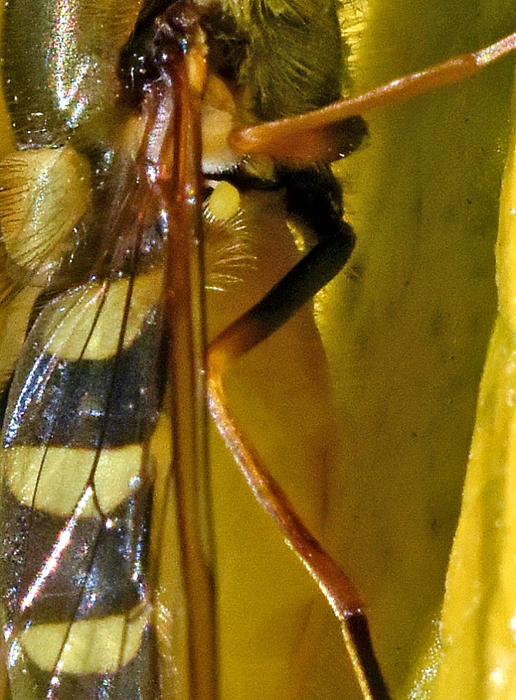 The next feature to look for is the hind femur. That’s the thickest section of the leg nearest the body. Female Syrphus ribesii can may be distinguished from the other two common species (Syrphus vitripennis and Syrphus torvus), by having entirely (well mostly) yellow femorae (hind legs). But if as in this case, it is a male, then it has got to have at least some black hairs on the yellow end nearest the tibia. But these hairs are absolutely tiny! In most of my shots, the end leg is inconveniently placed beneath the wings, so it is hard to see through the transparent wing membrane!