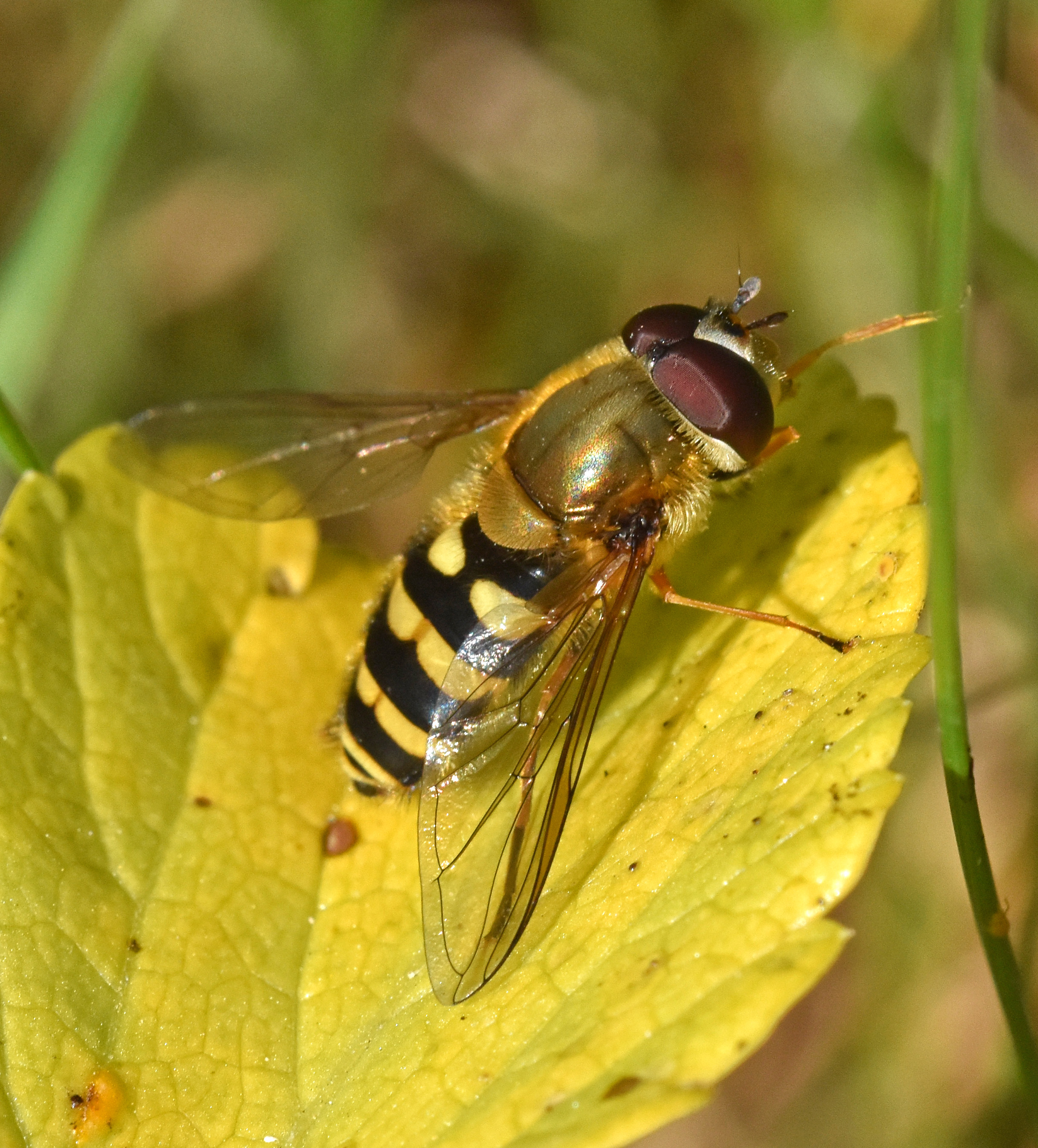 As an aside, here is a picture of another hoverfly species (Epistrophe eligans) – since I don’t have a photo of a female Syrphus ribesii – showing what it looks like when the eyes are well separated (below). The eyes of male hoverflies are usually larger than those of the females, and the dorsal part of the males’ eyes is specialized for the detection of females! The technical terms for these two types of eyes are: holoptic (male) and dichoptic (female) compound eyes