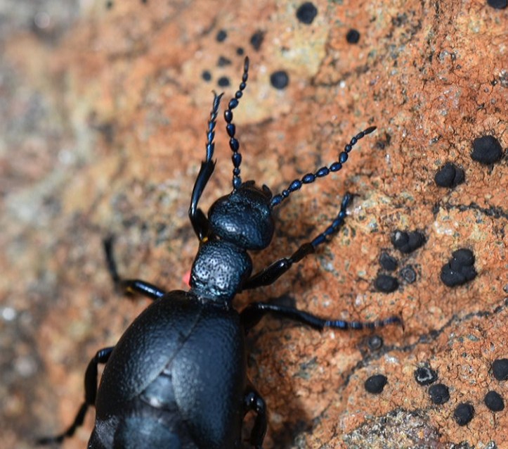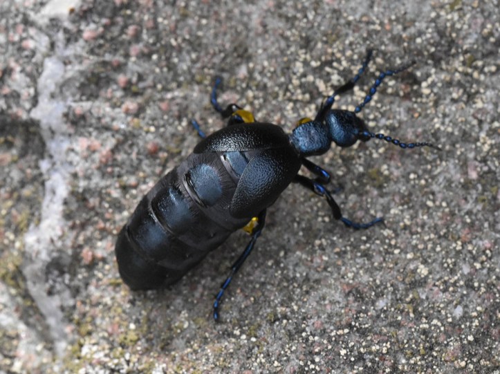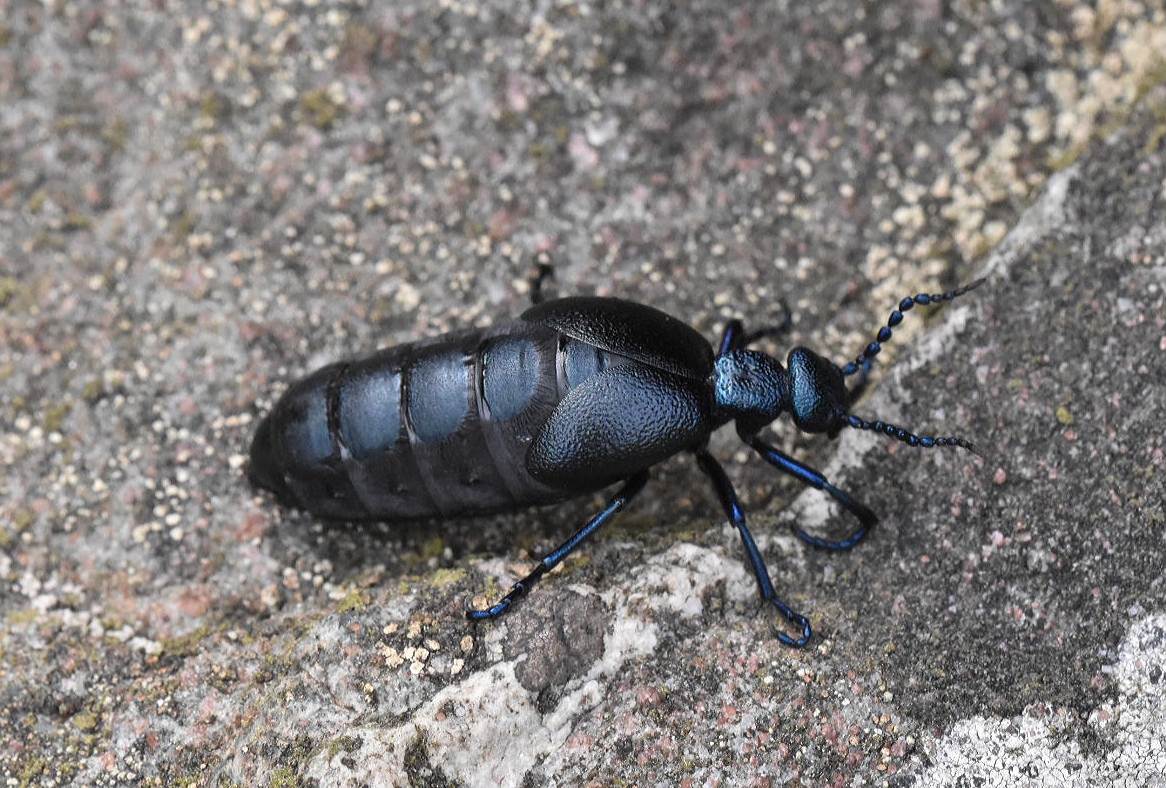 Oil beetles such as this produce oily droplets containing cantharadin, a toxin which is secreted by the male and given to the female as a copulatory gift during mating. Apparently she uses it to protect the eggs from predators.
