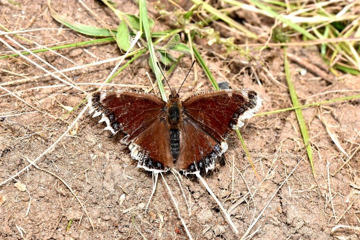 I was surprised to come across an incredibly worn Camberwell Beauty, presumably a survivor from the previous summer?