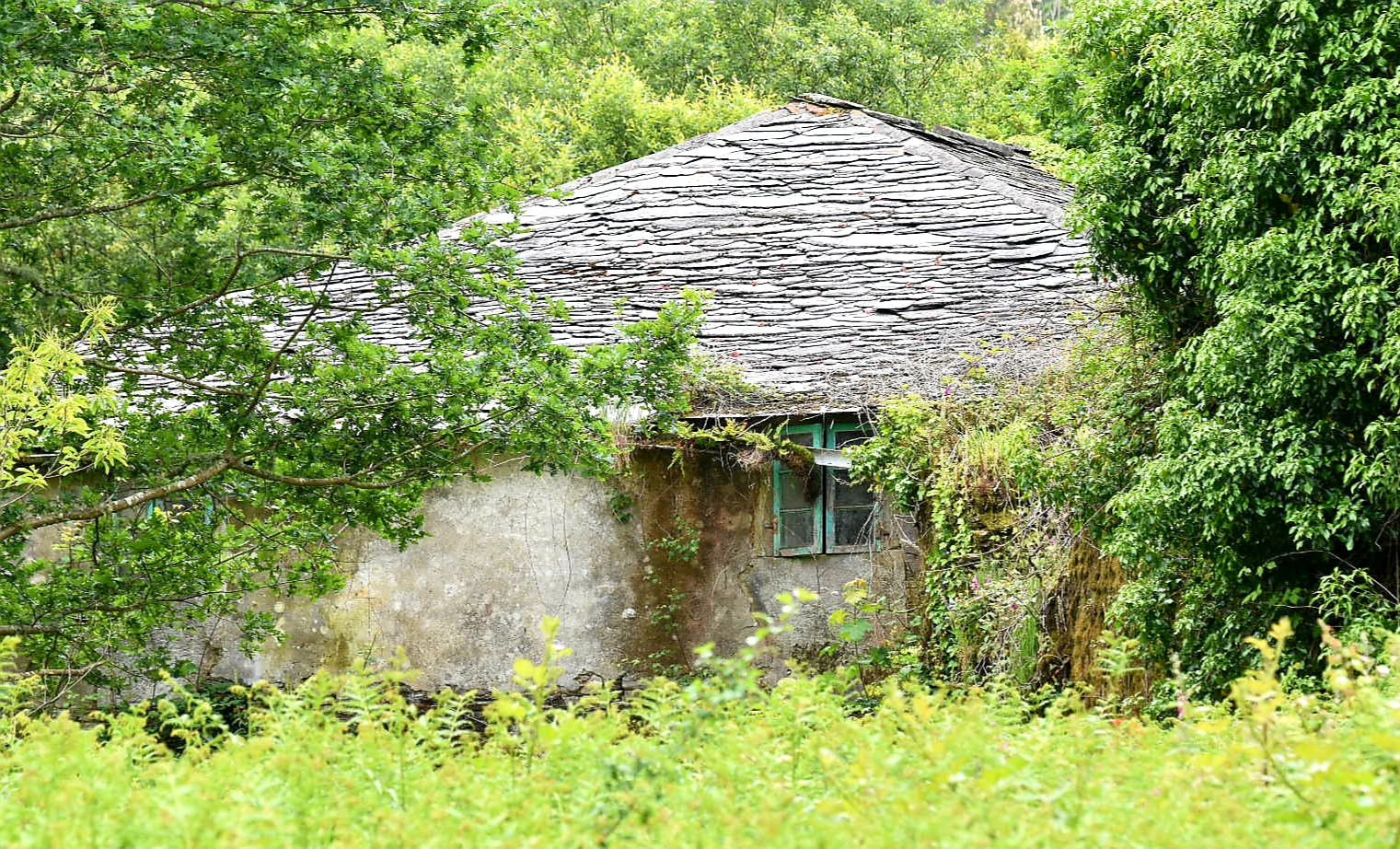 In this region of Galicia, there are many abandoned farms or homesteads. Crumbling stone buildings surrounded by unused meadows.