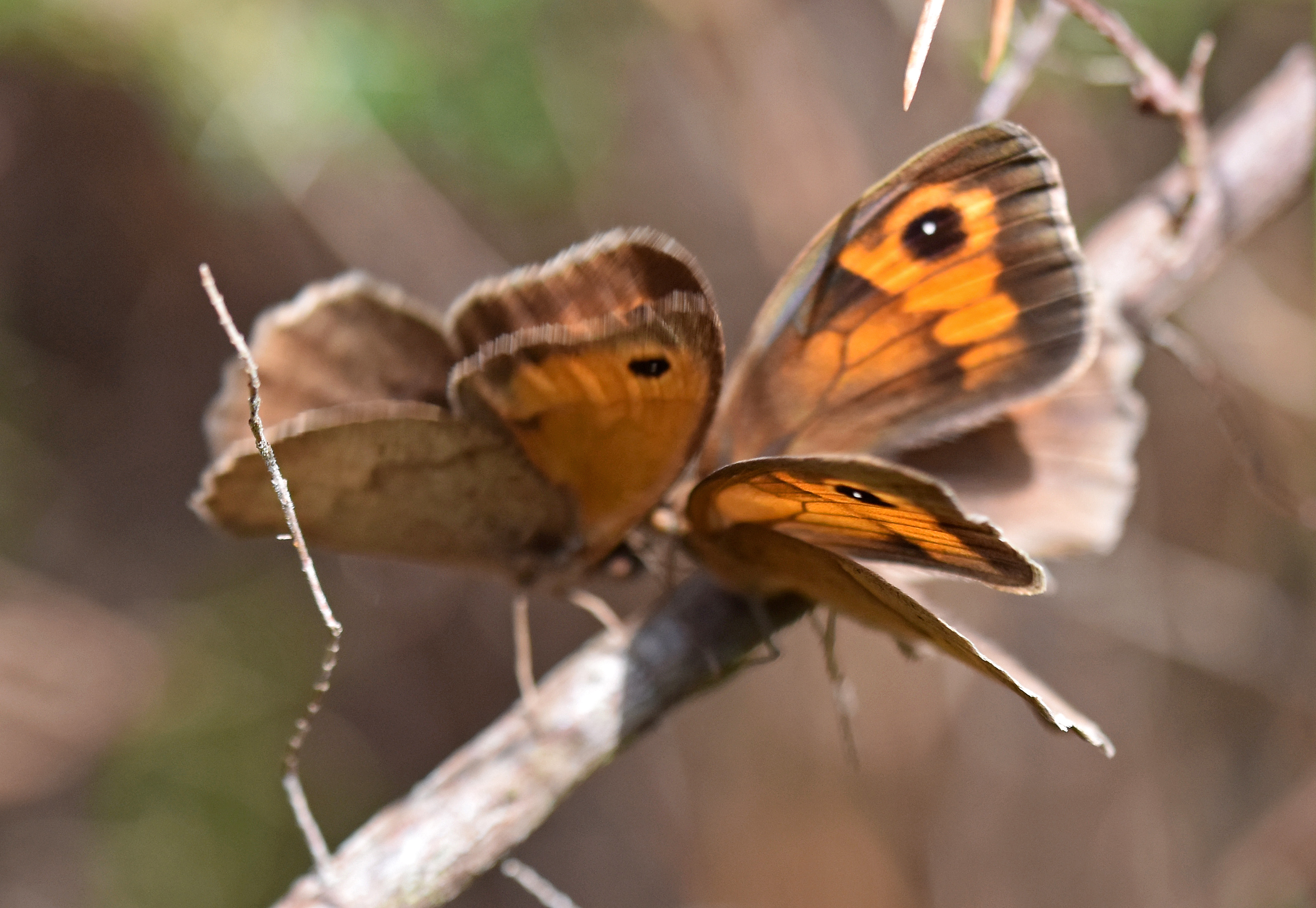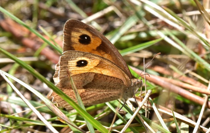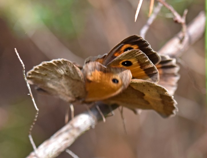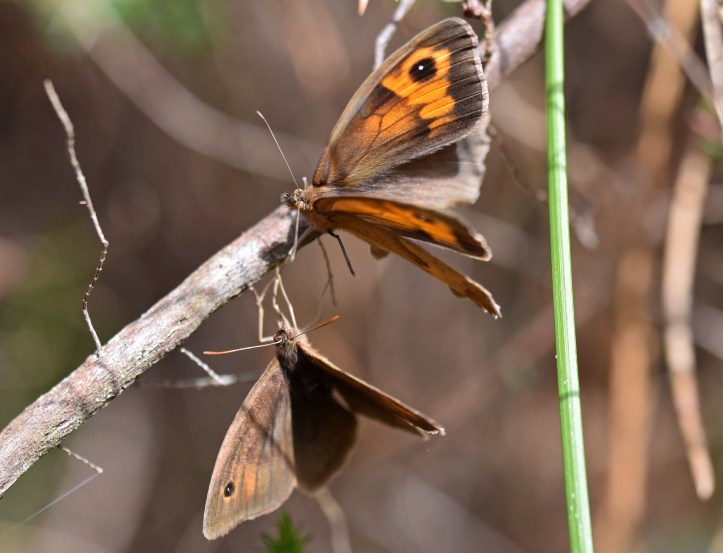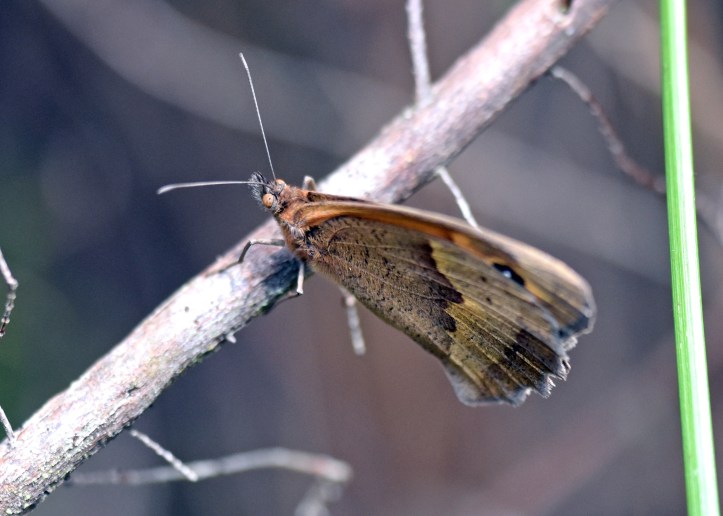 The two butterflies, which as it turned out were meadow browns, flew off the track into dense foliage (much of which was spiky gorse!). I was determined to try and capture this behaviour, so I pushed my way into the gorse and found the female sitting on a small, horizontal twig, not far off the ground (below). The male was also sitting still close by, but slightly out of sight.