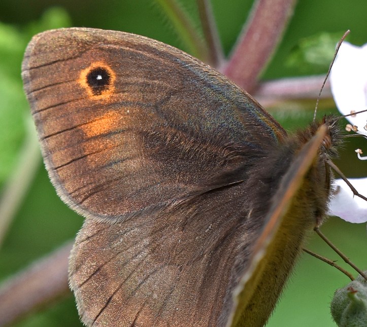 Meadow brown (Maniola jurtina) butterflies, must, I think, be one of the most common and widespread butterflies in Europe. I am surprised therefore, not to be able to find any photographs of courtship behaviour in this species. The excellent UK Butterflies website states that: “Courtship between male and female is brief. The male showers the female with scent scales from his sex brands which act as an aphrodisiac that seduces the female and mating quickly follows.” Adrian Hoskins (Learn about Butterflies), in his entry for the meadow brown, also describes the courtship ritual as being very brief, “in which the female adopts a fluttering and gliding flight just above the grasses, while the male flutters very closely behind her, almost making physical contact during flight.” This is, I think, the initial phase of courtship. The final phase, which may or may not lead on to mating – it usually does not, for reason described below – is the one in which the male brushes the female’s antennae with his androconia (i.e. sex brands). The long, tufted, androconial scales can be seen on the forewings of newly emerged, male meadow browns, such as the one shown below.