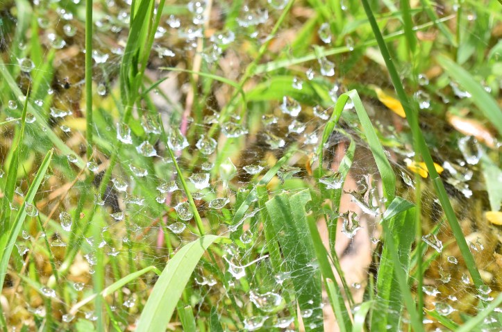 In some instances, one is drawn into the tiny world, like Alice going down the rabbit hole! In this case, my eye was drawn to the lovely patterns of dew drops, sparkling in the sunshine, caught on the strands of a spider’s web (below).