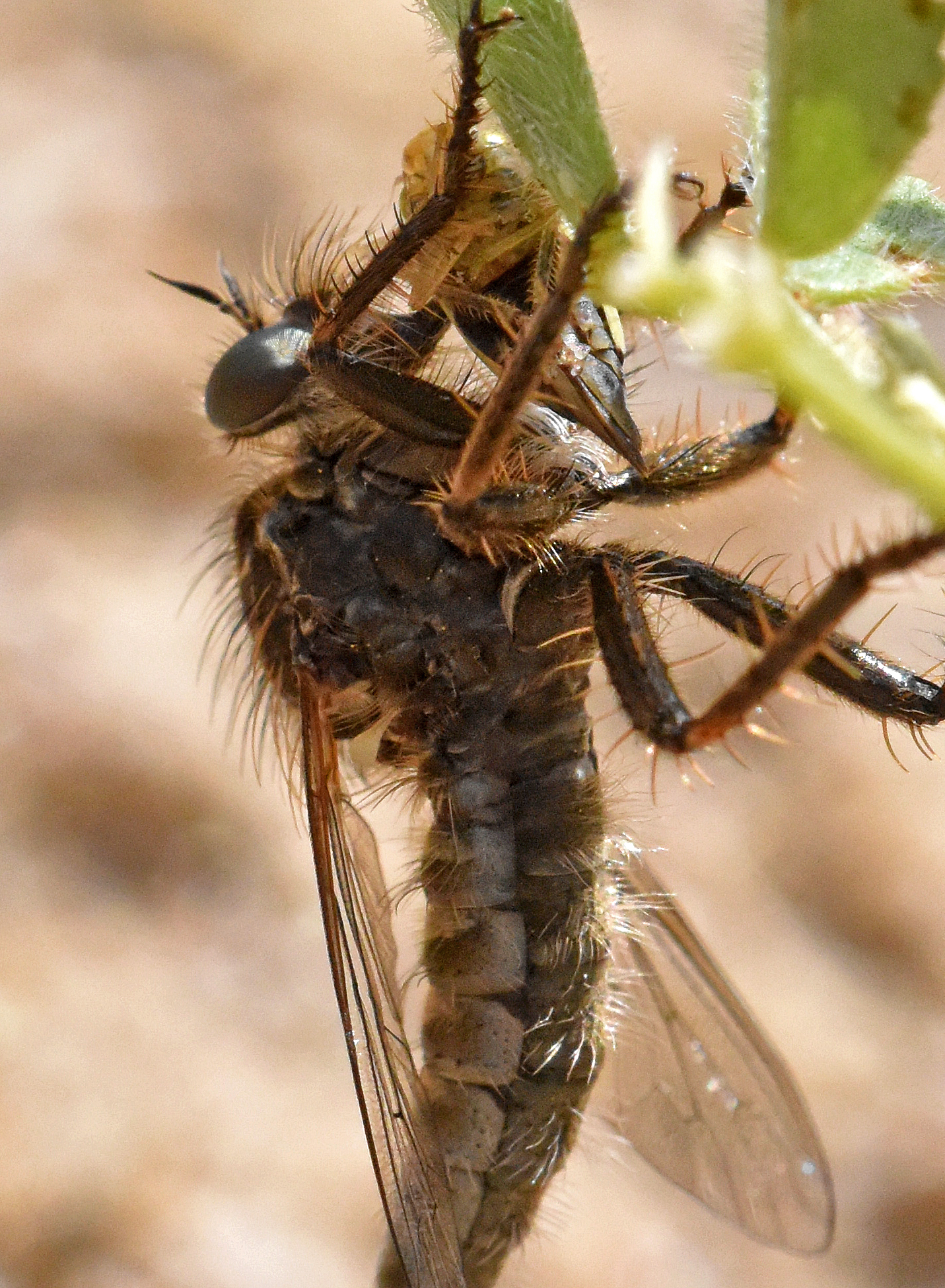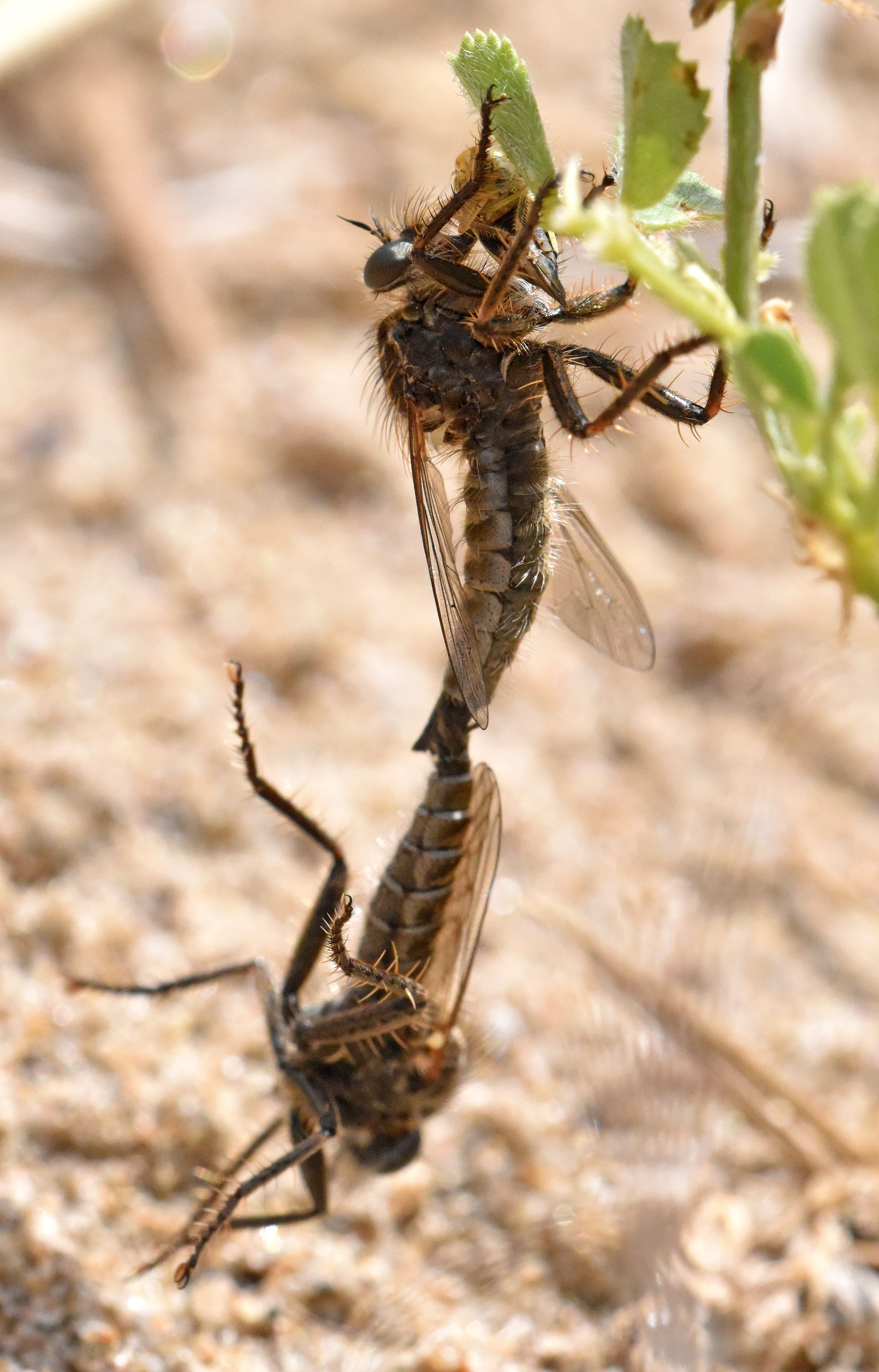 One of the greatest pleasures of entering the world of the ‘smaller majority’ as Piotr Naskrecki – a great macro photographer – refers to invertebrates, is the unexpected! In the following photographs (see below) of a pair of robberflies – Dysmachus trigonus, the fan-bristled robberfly, perhaps – it turned out that the one at the top had something in her grasp! Surely a nuptial gift? In many different sorts of flies – and other insects – the male gives the female a prey item as a gift, prior to copulation. It functions to facilitate copulation and acts as a contribution to the protein requirements of egg laying by the female. In some instances, it also protects the male from being attacked, and even eaten, by aggressive females, e.g. in some spiders. In other species, such as the scorpionfly, Hylobittacus apicalis, and perhaps in these flies as well (?), the female feeds on the nuptial gift throughout copulation. If the gift is too small, she may decline to copulate at all, and fly off after sampling it. Too small!! Find me another one!