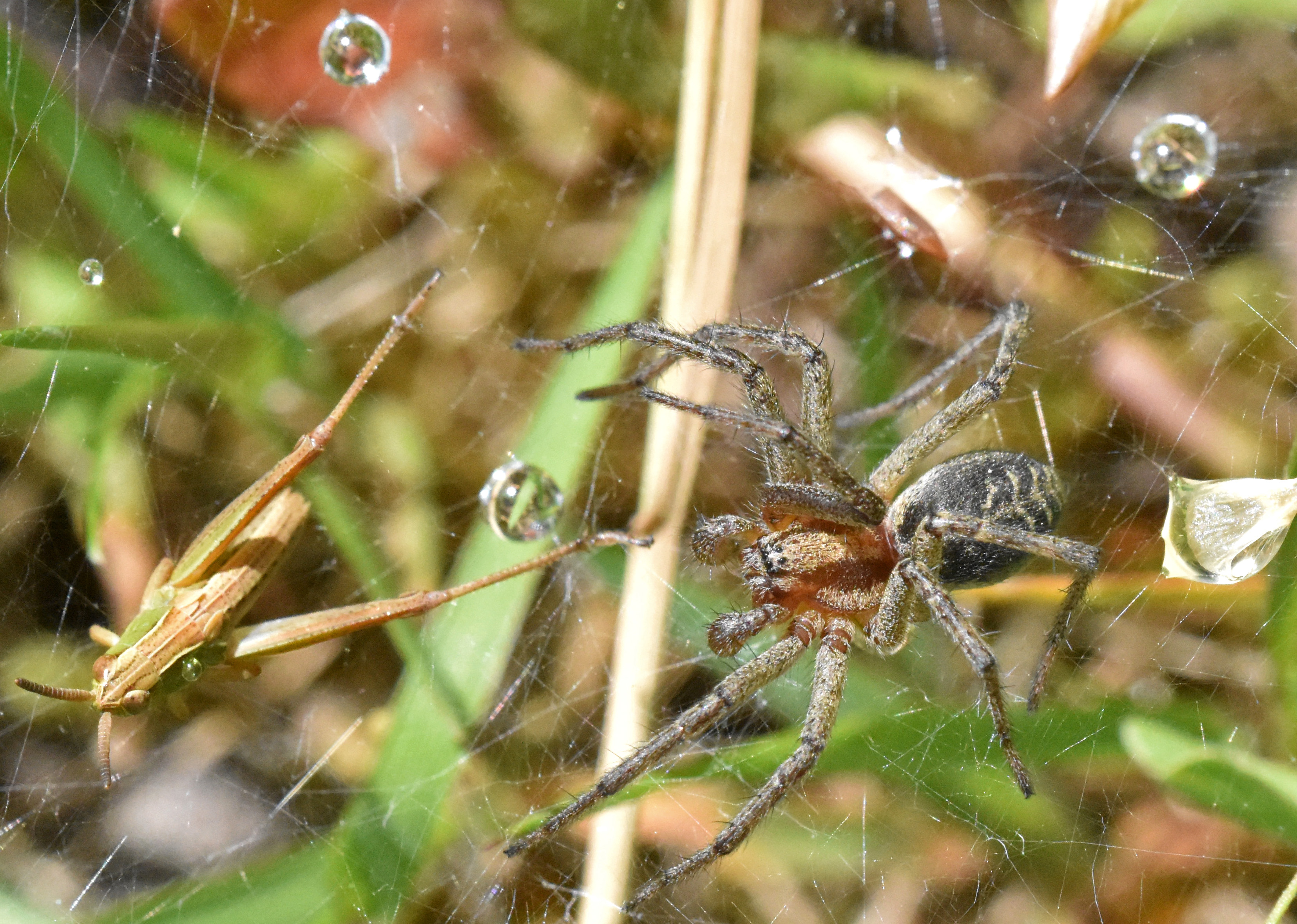 Such a pretty scene; but look closer and a drama starts to unfold! A spider, whose web it is, is inching up on a poor grasshopper nymph (below), caught in the net! Oh no! This tiny little nymph is not going to make it to adulthood. How tragic is that?! A lesson about nature: it eats it’s own. It’s not designed by some benign God. Creatures get gobbled up by other creatures. Somehow it all seems to fit together though. That is until we mess it up.