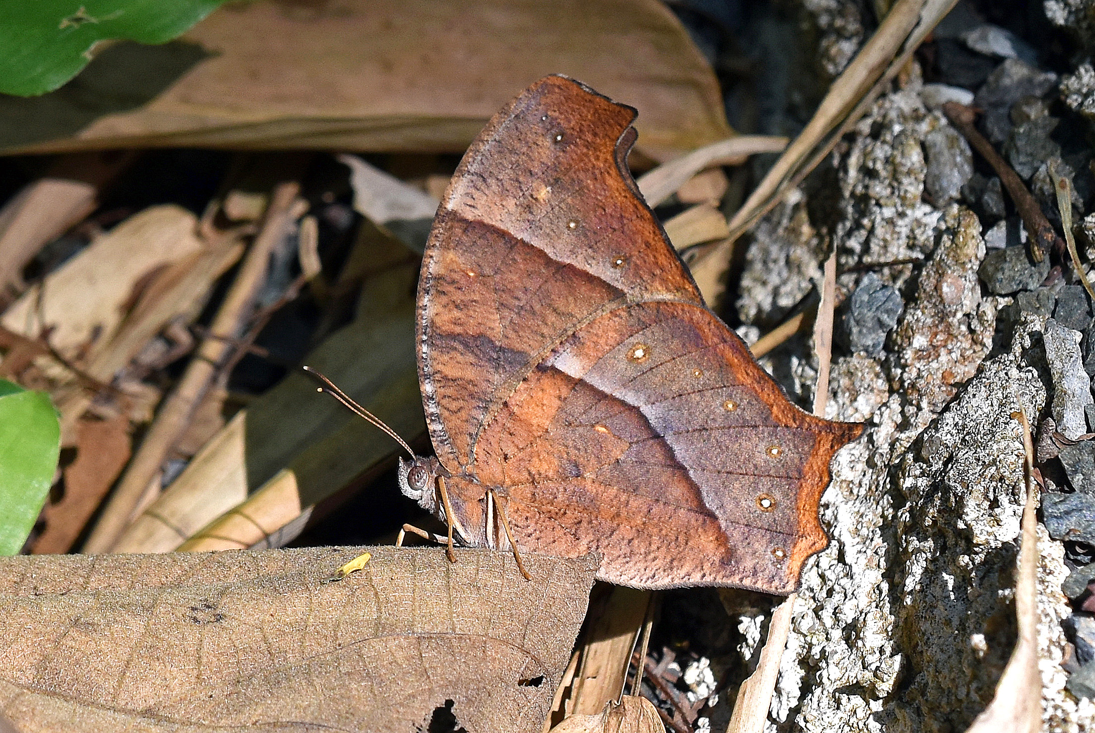 Great Evening Brown (Melanitis zitenius) wet season form on dry leaf. Thailand