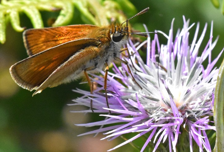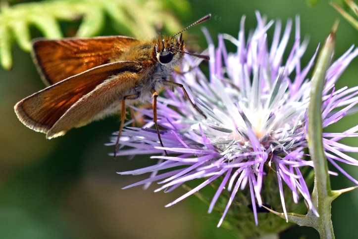 Lulworth skipper (Thymelicus acteon) having just landed on on a thistle flower