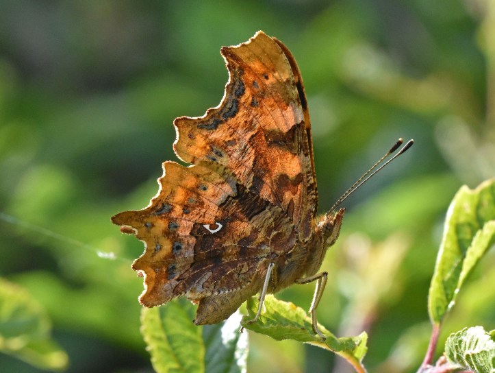 There are often two generations of this butterfly in England and Wales (it is also expanding north into Scotland). The first generation to develop and emerge in the summer, are the golden brown, or orange-brown hutchinsoni forms. They mate and give rise to a second generation, which usually emerge in August or September. These second brood commas are much darker (see below) – which probably helps then absorb more of the late summer sunshine – and this form, or morph, generally goes on to hibernate over winter.