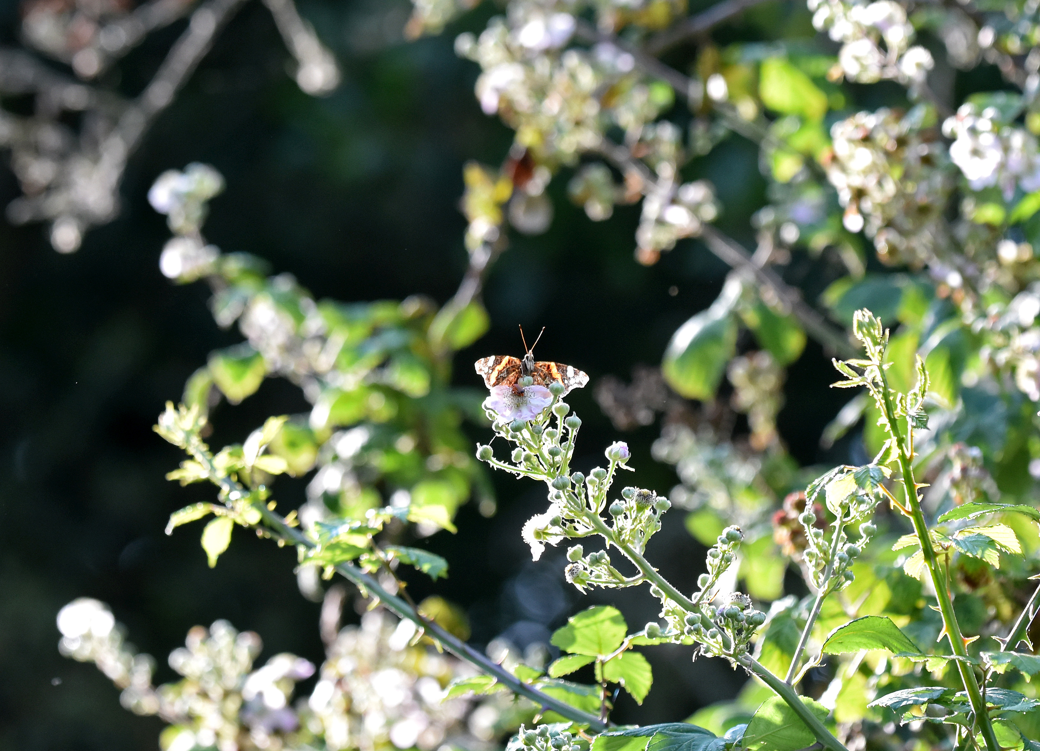 Some of the other butterflies in the vicinity – getting chased by the commas! – were Red admirals. Here is one (below) perched high up, keeping an eye on the proceedings, looking down on the patch occupied by the comma!