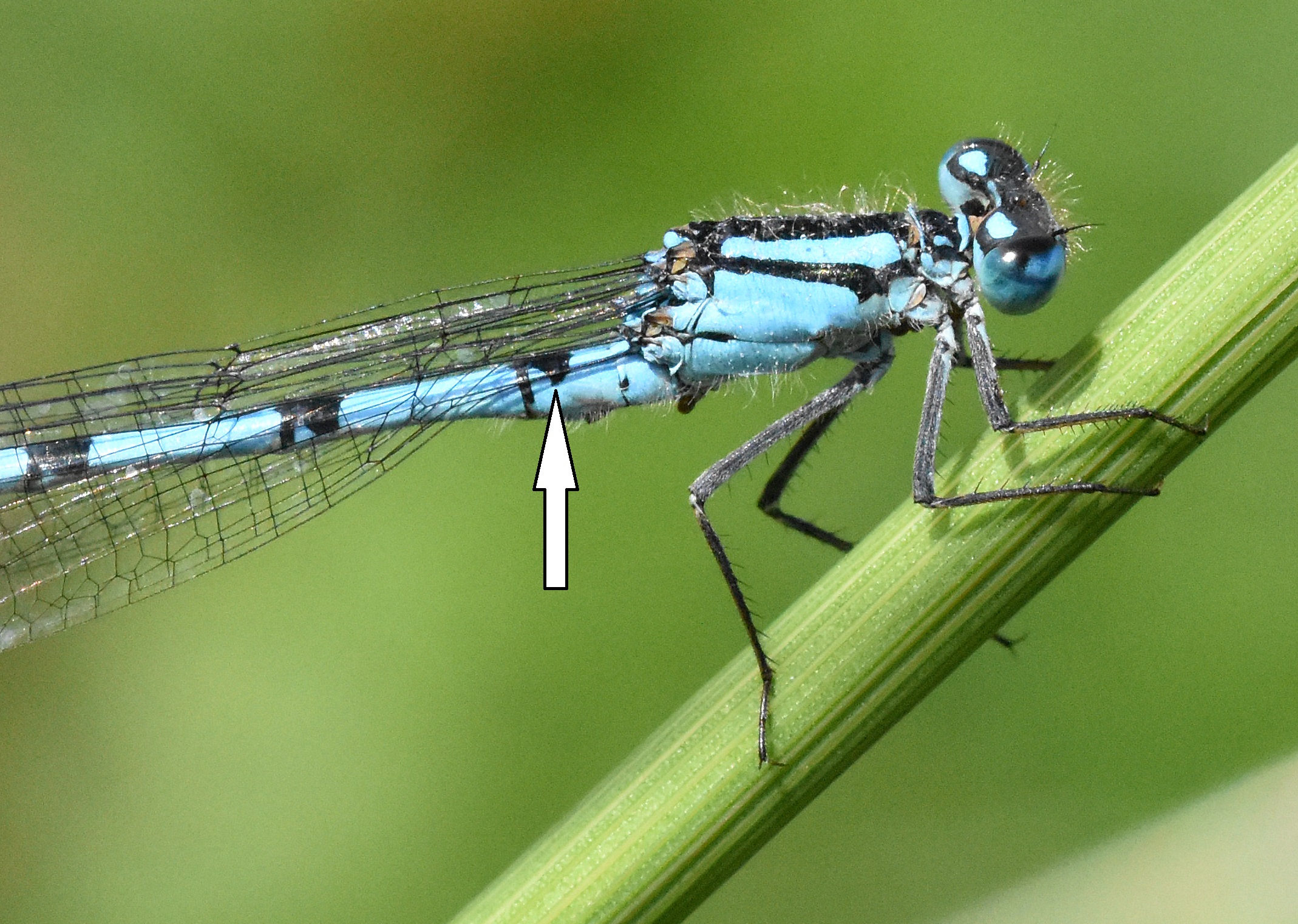 Common Blue Damselfly (Enallagma cyathigerum) male showing black club mark on S2