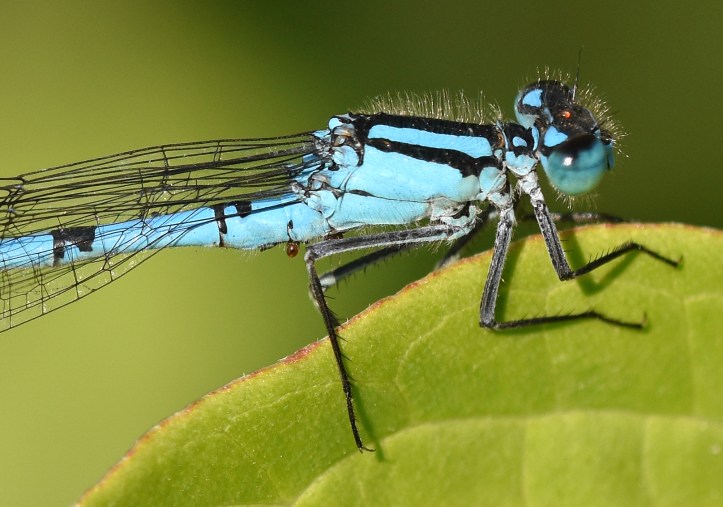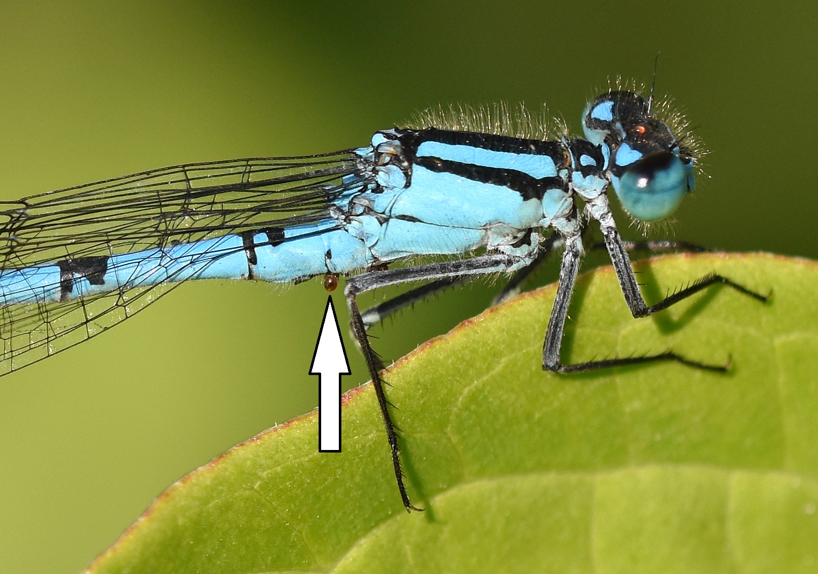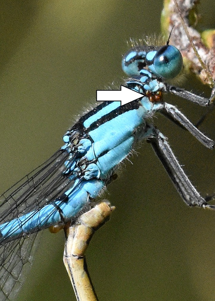 Common Blue Damselfly (Enallagma cyathigerum) mating male with mites shown (white arrow)
