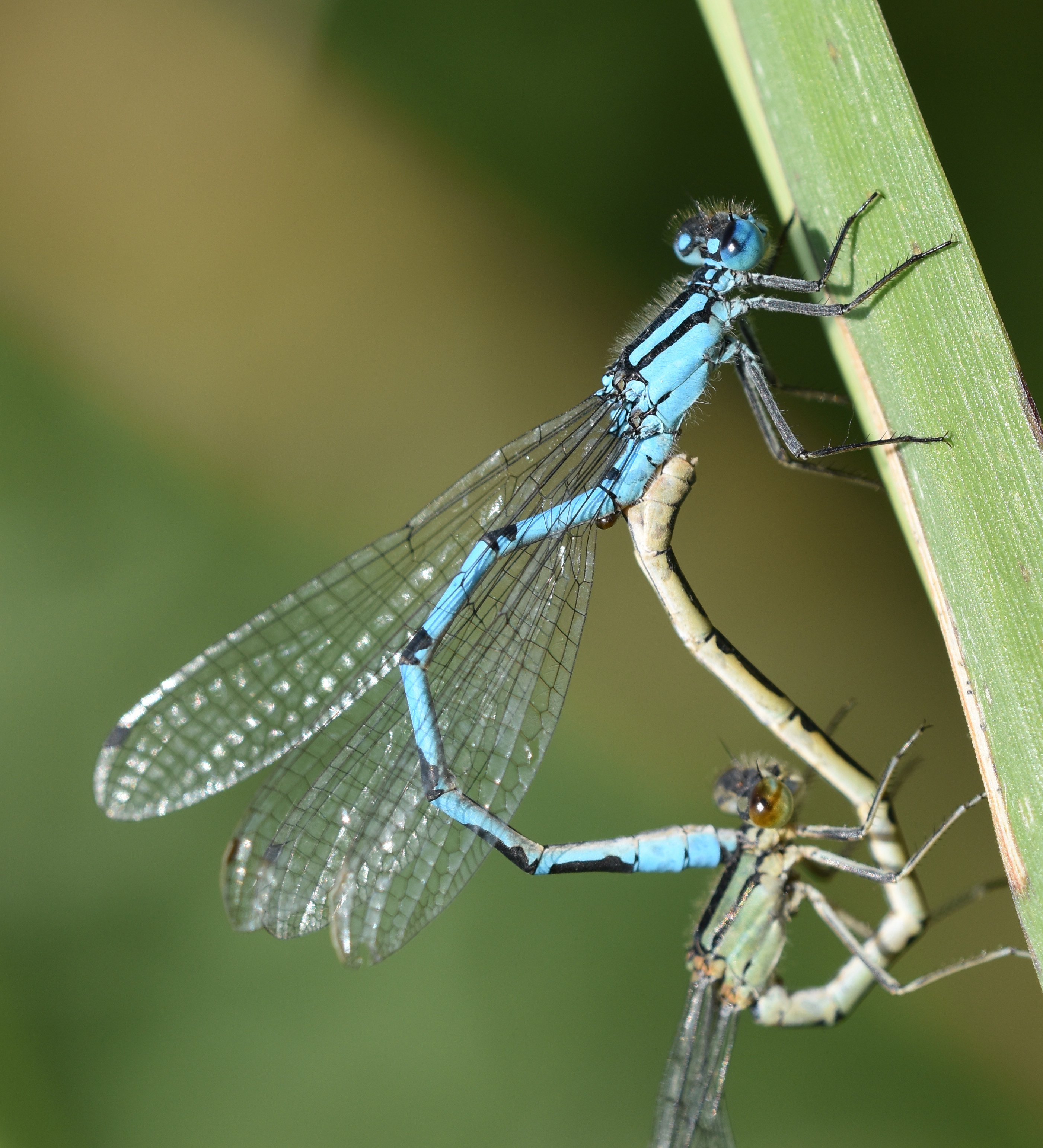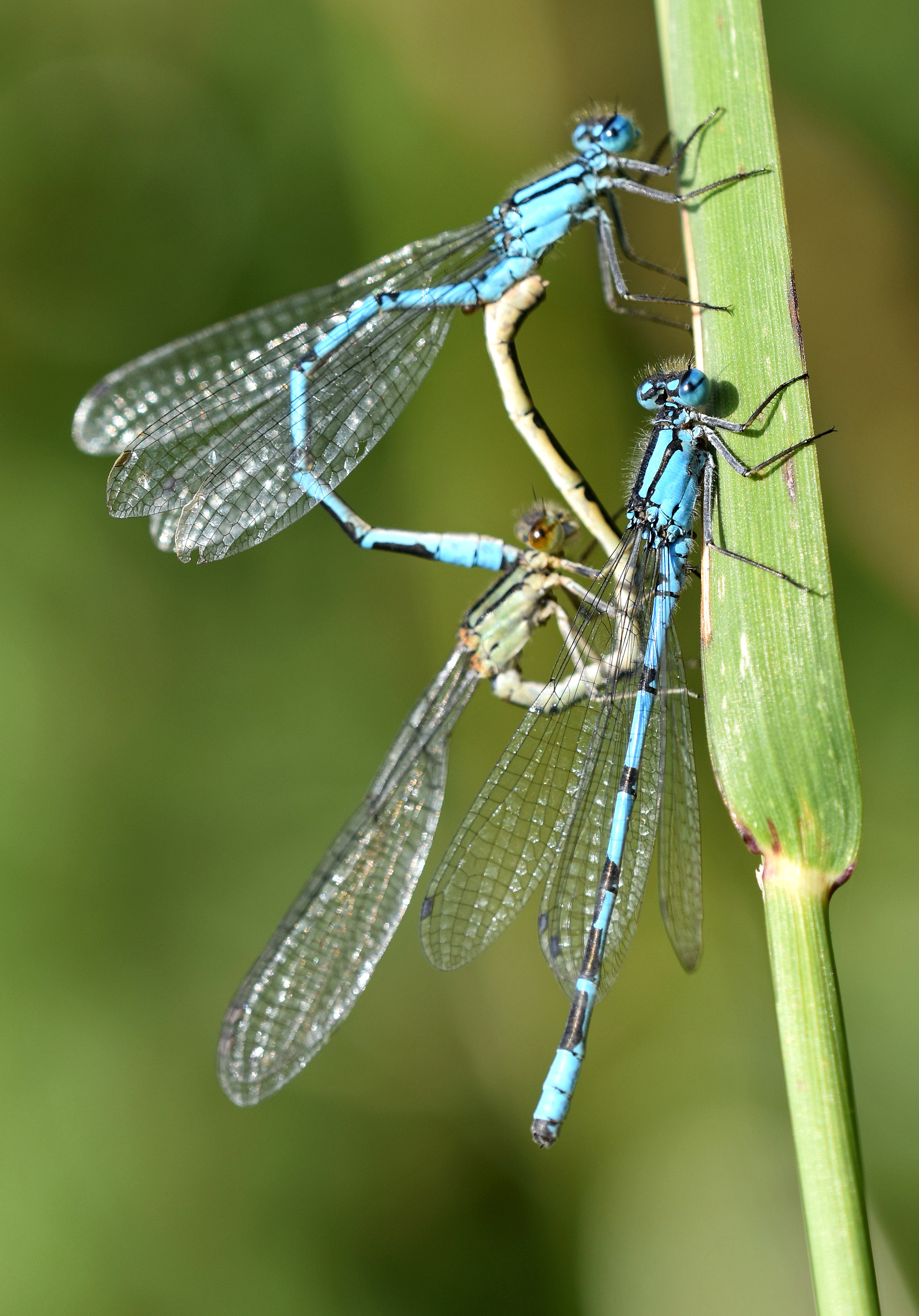 Common Blue Damselfly (Enallagma cyathigerum) mating pair: female being clasped by male