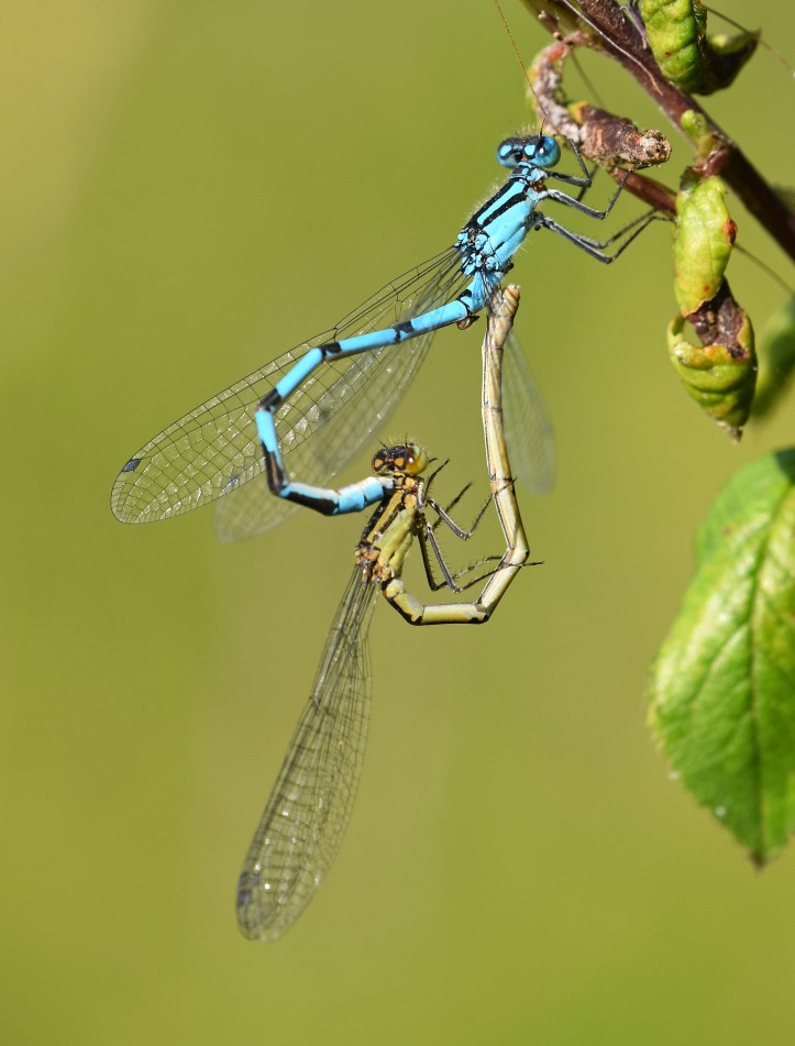 One day, earlier in the summer (on 28th June 19), I came across huge numbers of common blue damselflies (Enallagma cyathigerum) which had emerged from a lake – Felmersham gravel pits – and were basking in the sunshine on vegetation round about. Many of them were mating, and I took a series of photographs of a couple of mating pairs. The males are bright blue (below) whilst the females are variable in colour. Some females look like the males – a cunning ploy to avoid getting too hassled by the males! – whilst others are distinct, being brown or green (as here).
