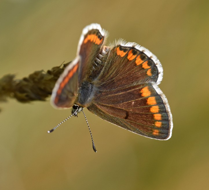One of the reasons for its increased abundance, is climate change. This species is at the northern limit of its distribution in the UK and as average temperatures have increased in recent decades, Brown Argus populations have shifted north, colonising many new areas: such as the North York Moors for example. On average, it is thought to have moved 79 kilometers northward in Britain in 20 years (Pateman et al., 2012). The first beachhead landing in Yorkshire, of the expanding population, was at the tip of Spurn NNR! (Frost, 2005). The Brown Argus (A. agestis) has now started to hybridise with the Northern Brown Argus (A. artaxerxes), which mostly occurs in northern Britain, but they are largely separate species, I understand.