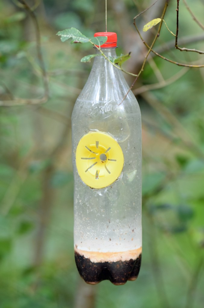 Asian hornets are monitored throughout the region (see Link below). The traps that are employed are often very simple devices, containing mixtures of sweet smelling substances, such as beer, fruit juices and sugar, for example (see below). Commercial traps and baits are also available (see Rodríguez-Flores et al., 2019), but unfortunately they all attract and catch a wide variety of other insects. Non-target insects caught in these non-selective traps include, native hornets, honey bees, flies and lepidopterans, so there is an urgent need to develop more effective traps. A sex pheromone, produced by the female hornets (gynes) has recently been discovered (Wen et al., 2017) which should at least result in more effective ways of trapping the males.