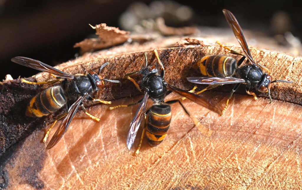 Asian hornets (Vespa velutina nigrithorax) feeding on sap from recently cut Eucalyptus logs. Galicia, Spain