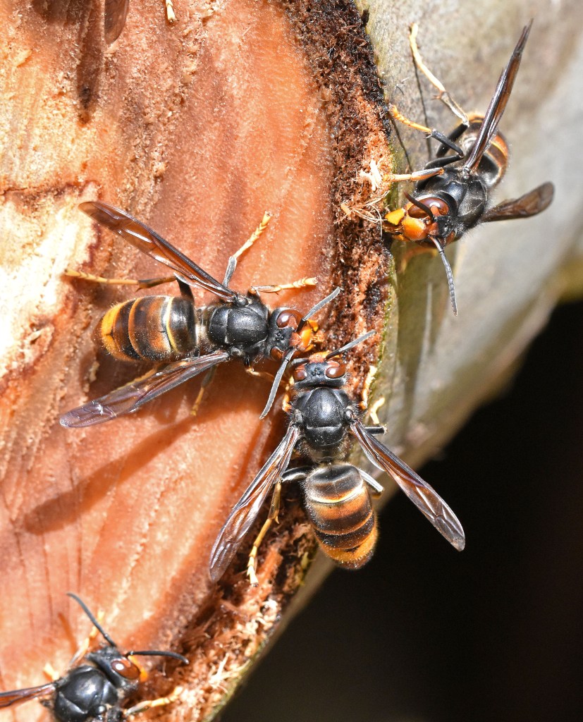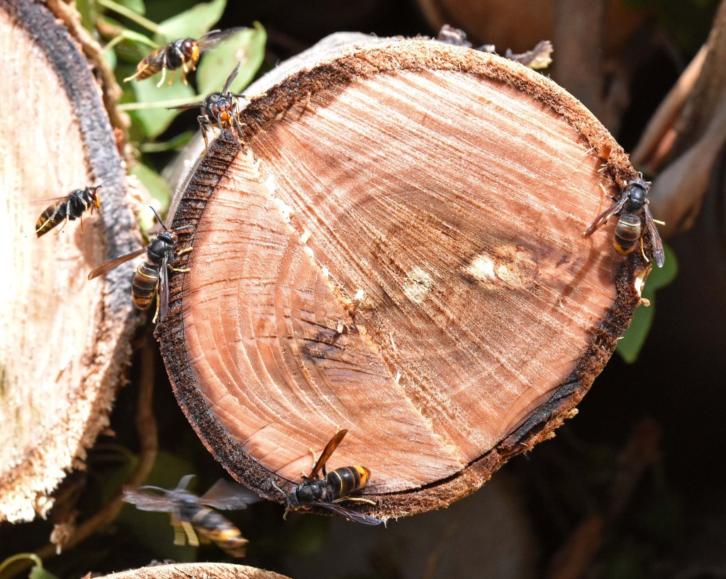 Vespa velutina nigrithorax hornets swarming around cut Eucalyptus logs.