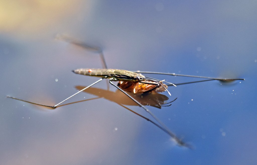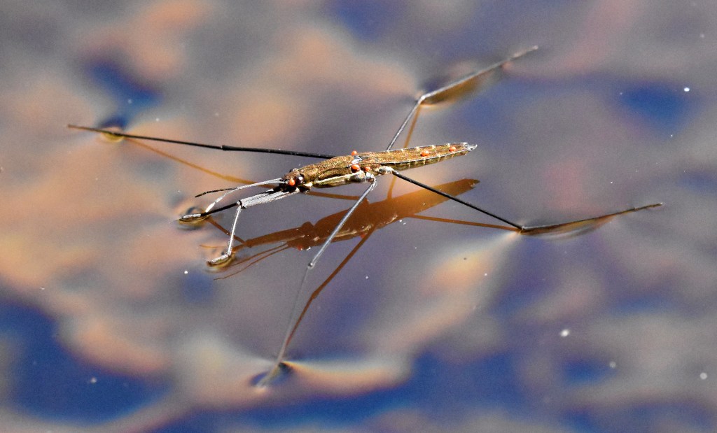 The water surface can be a messy place – especially when it is glassy smooth and unperturbed, as in the following two photographs (below) – but it also a habitat full of potential finds and opportunities; it is where gerrids find their food and live their lives. Lots of insects fall into the water, get trapped by the surface tension, and end up as food for surface dwelling species such as pond skaters. When gerrids get hold of a prey item, they appear to plunge their large proboscis into it and suck the insect dry!